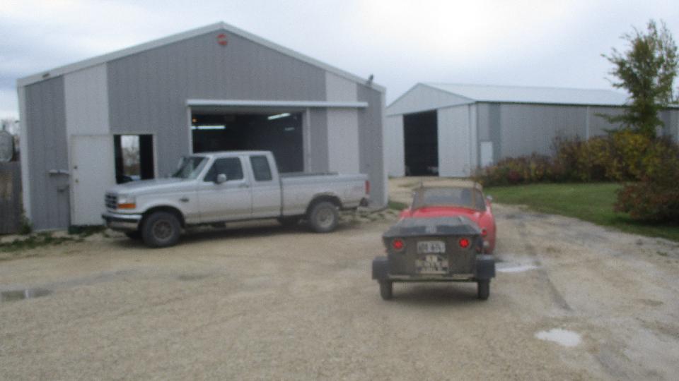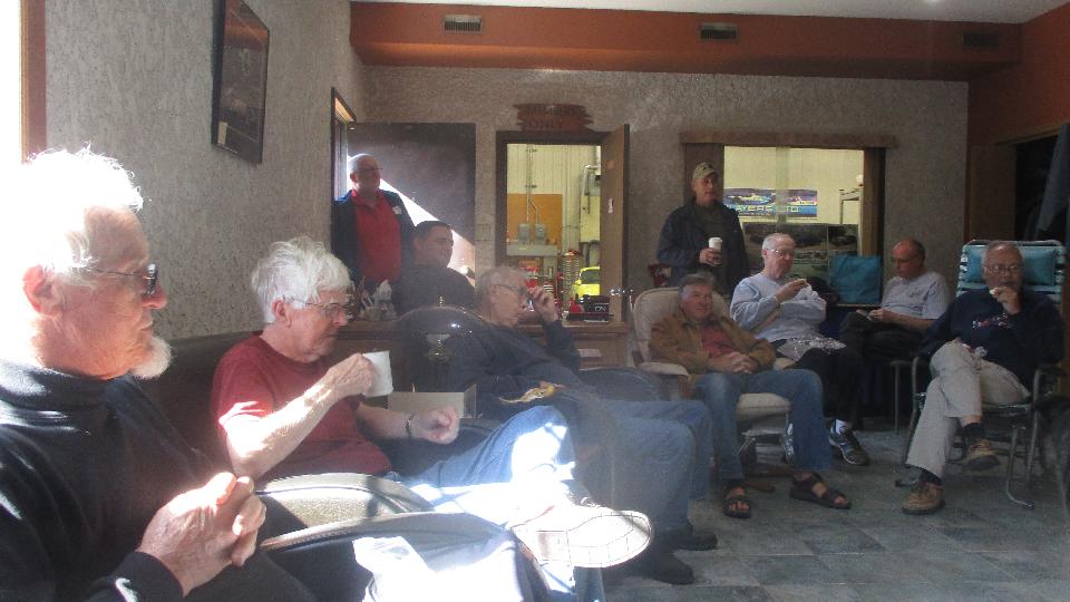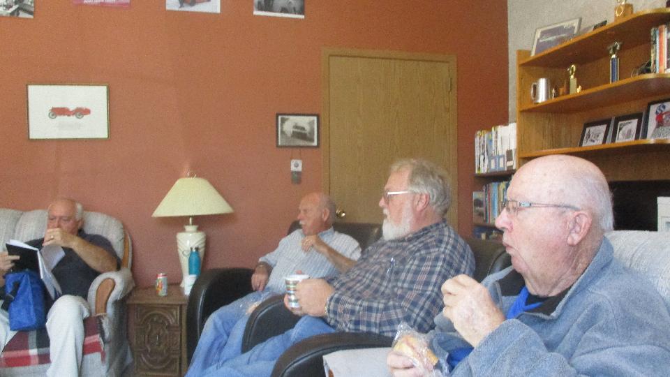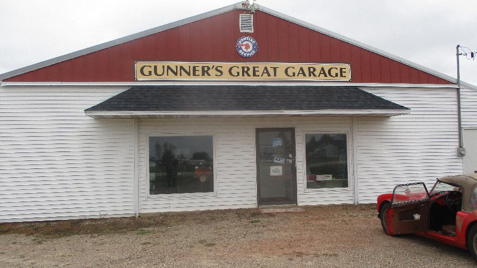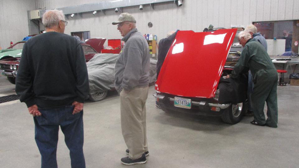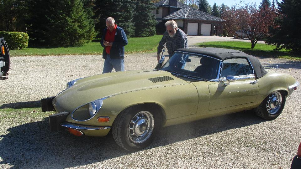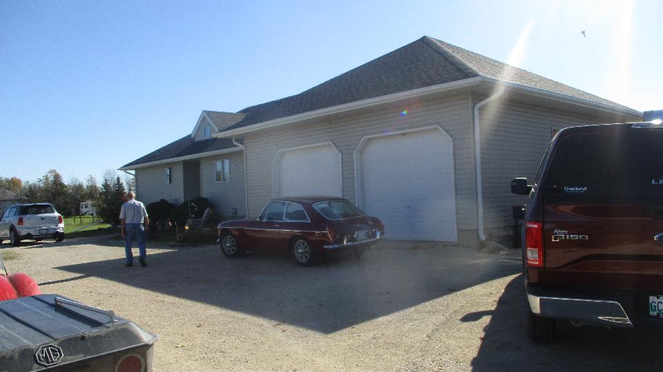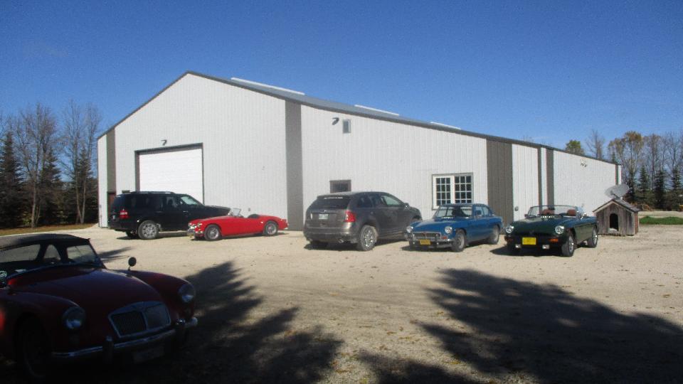 We had an 8-am appointment with some Brit car enthusiasts at the home shop of Graham Lowden in rural St. Clements, MB. No one there that early, so we had time from breakfast before the gang began to arrive after which they turned out in force. Not a commercial shop, just an invite for friends to get together to work on the cars every Wednesday (which means they are mostly retired folks). Big shop with drive around space inside. Nice lounge in front, followed by a kitchen.