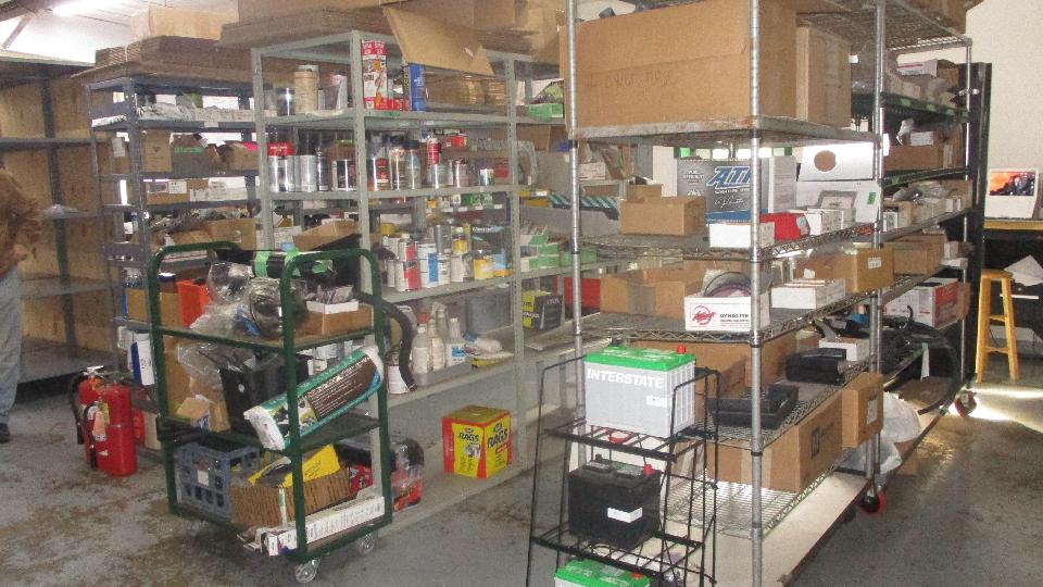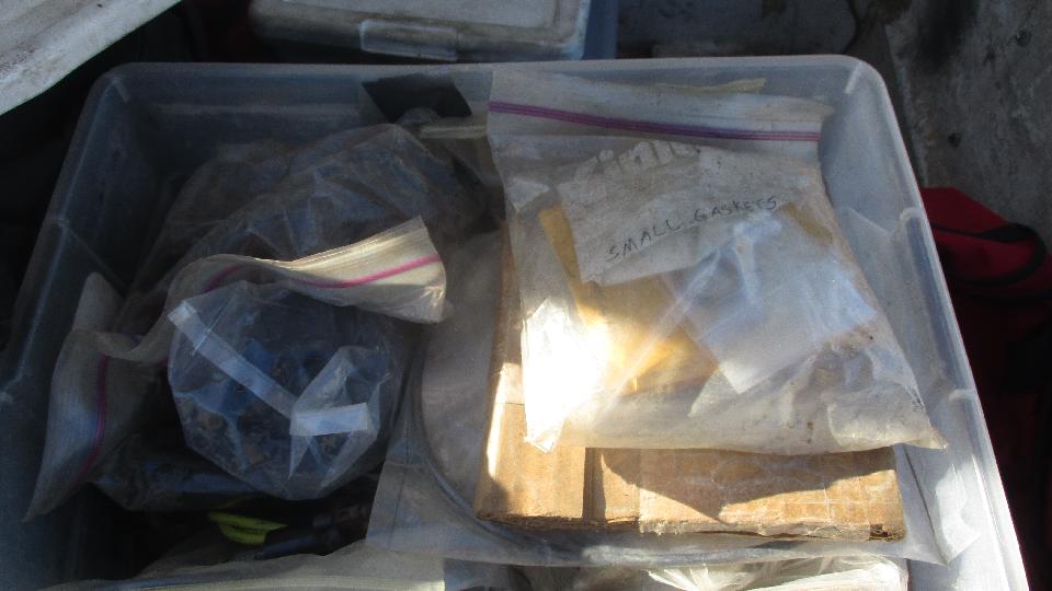 The rolling chassis is for a Jaguar, something fairly large (but can't remember which model). Some more "feed stock" outside, and a peek at some of the indoor storage space. The tough jobs come here.