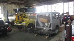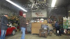 Then we were off to visit Gunner's Great Garage in Manawa, Wisconsin, advertising restorations, books, gifts, appraisals. Shop was closed when we arrived, so we made the phone call. All the fun was happening 15 miles away at another facility in Waupaca, WI, so off we went. The sign says "Hansen", but that was the previous owner, recent acquisition, no time to change the sign yet. Say hello to the owner John "Gunner" Gunnell. This building has a 100 year history, so hang on.