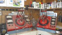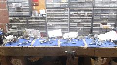 By coincidence, he was just drying off some freshly cleaned MGA distributor bodies as I was arriving. Lots of little bits on the assembly bench as he was about to put some of them back together. And the Sun distributor testing and calibration machines, well, it seems he has at least a dozen of those sitting around somewhere.