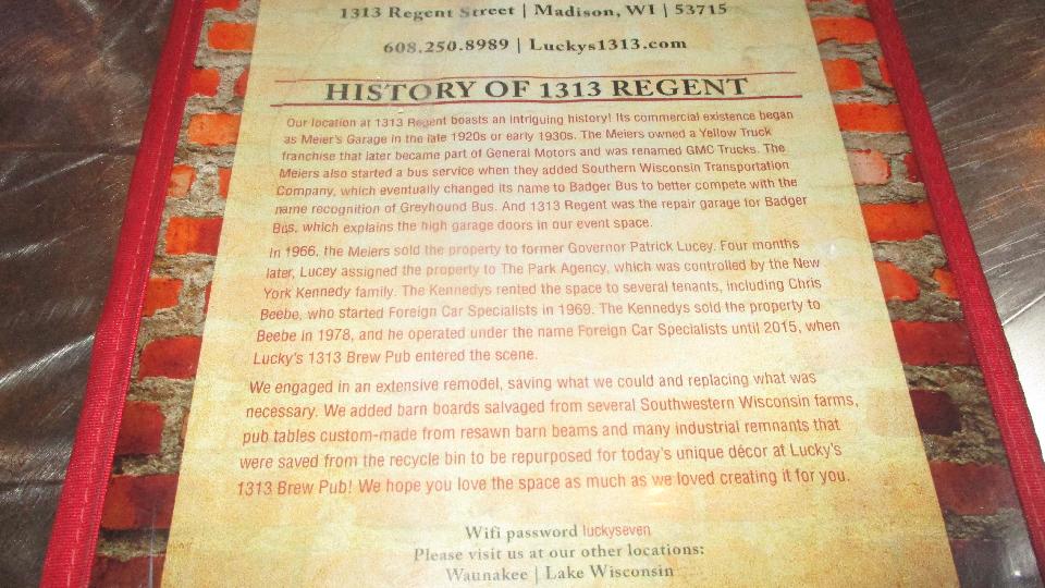 Our net stop was in interesting fizzle. We were looking for Foreign Car Specialists when we ran across "Lucky's 1313 Brew Pub" at 1313 Regent Street in Madison, Wisconsin. The vintage car service specialist is gone since 2015 when this micro-brewery took over the building. Their menu cover relates the history of the building beginning with Meiers Garage (Yellow Truck Franchise) in the late 1920's, then became General Motors, then GM Truck, and a repair center for Badge Bus. In 1966 it became rental property, to be occupied by Foreign Car Specialists in 1969 continuing until 2015 (a 46 year run) when it became Lucky's 1313 Brew Pub.