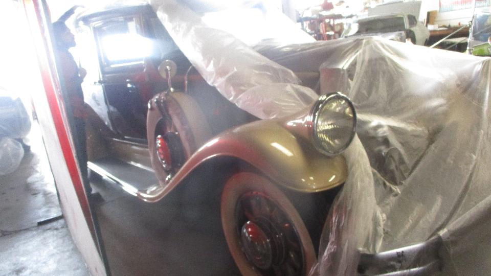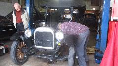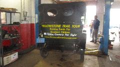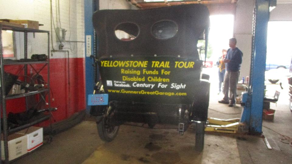John has a fondness for old Oakland cars (among other things). He bought this garage a while back before he found out it was a dealer and service shop for Oakland cars 100 years ago. Very recently he bought the 1917 Oakland that was in the shop today. It is currently engaged in a run of the Yellowstone Trail Tour, raising funds for disabled children. Twenty-five miles into the run the car lost oil pressure with a failing connecting rod bearing. The car was then loaded onto a trailer to continue the tour, subsequently landing here at the shop, which coincidentally happens to be on the tour route. With plenty of helping hands a new rod bearing was installed, and the oil pan was cleaned and painted. That resulted in a leak in the pan which was quickly patched before the car was to continue the tour.