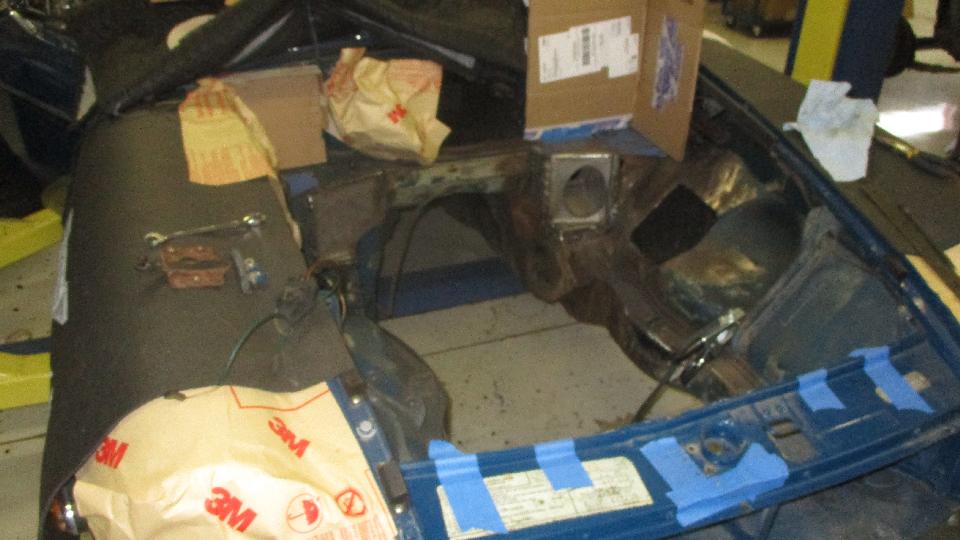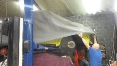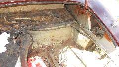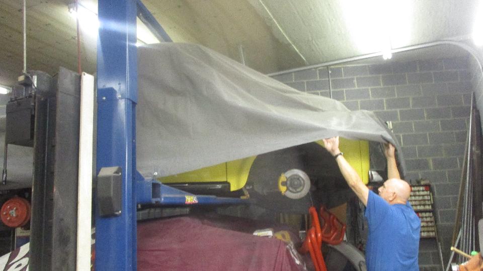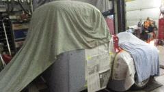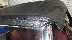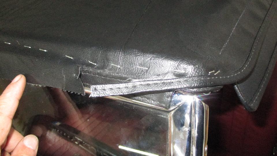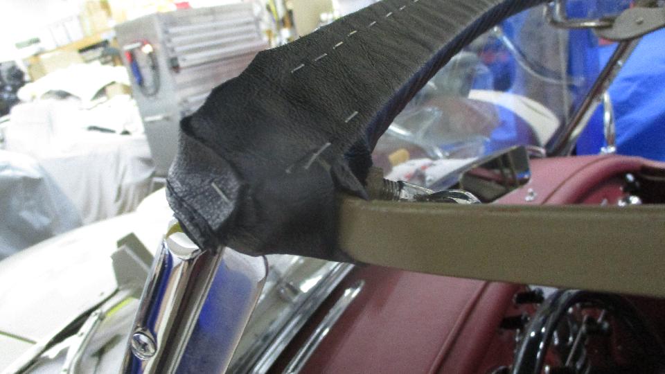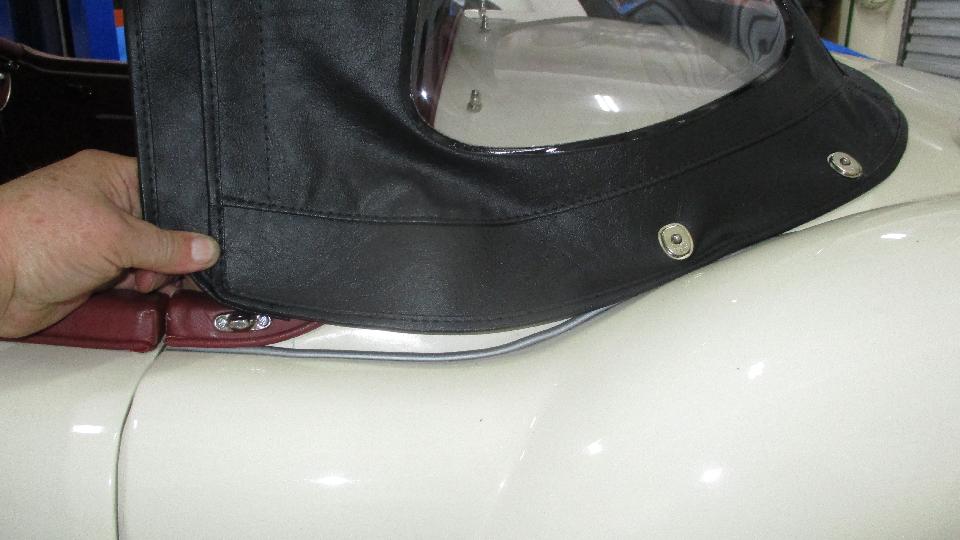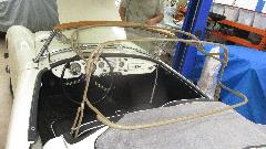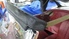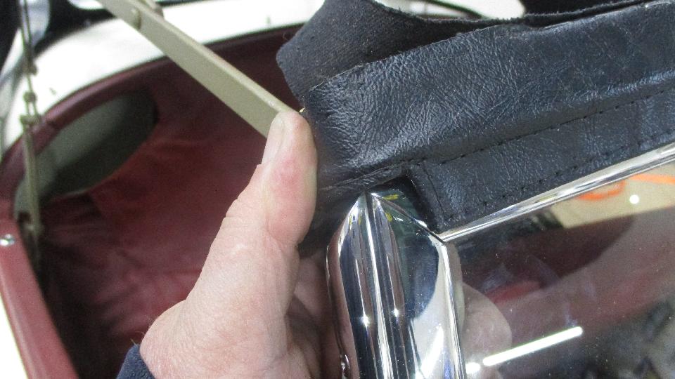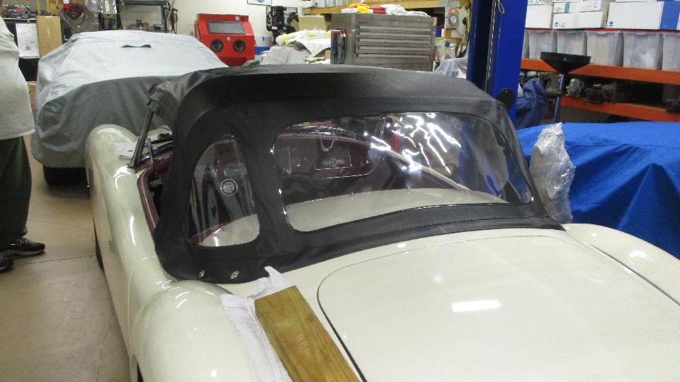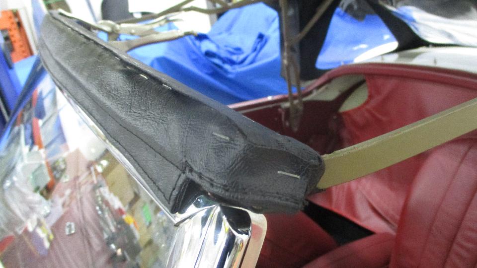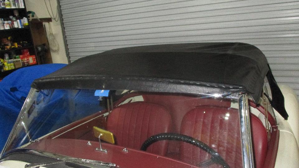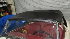 too short to reach the required final position. This must be a result of the rear metal bow of the later stye top frame being too wide for the early style narrower canopy. There ensued some discussion on whether it might be possible to heat and stretch the vinyl fabric that much, and how to go about it. Otherwise it was late evening, time for a break and dinner, so we will set this aside for later consideration (good time to sleep on the problem).