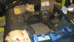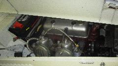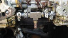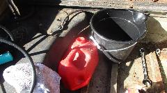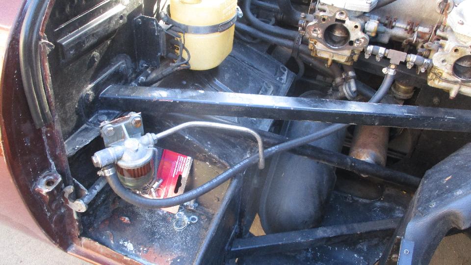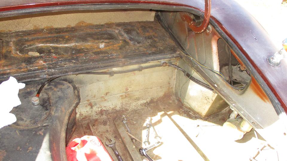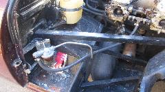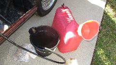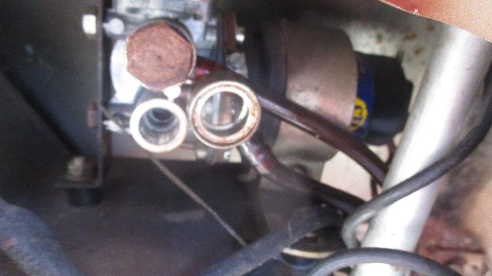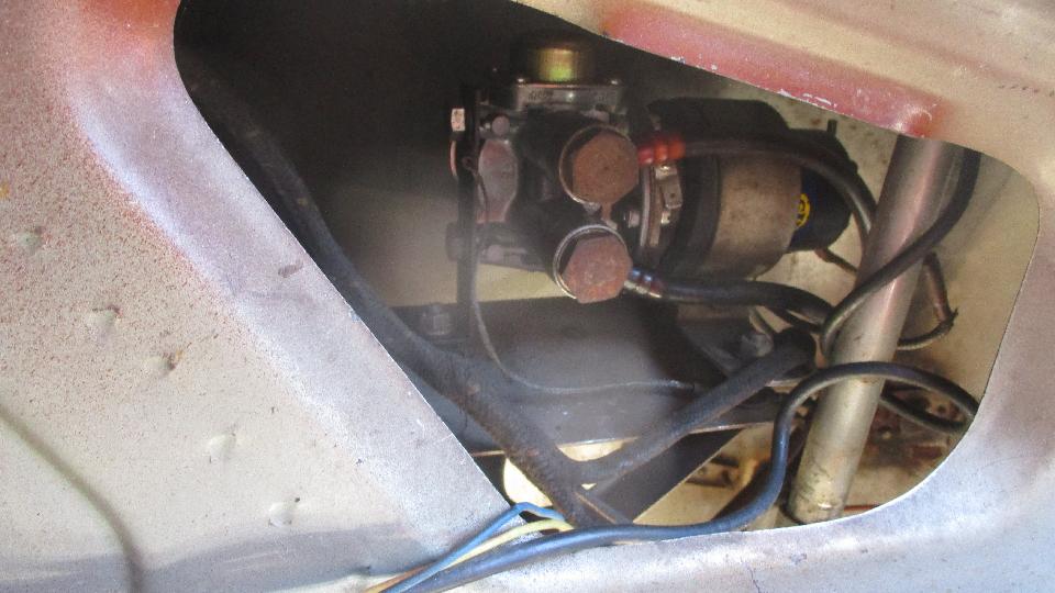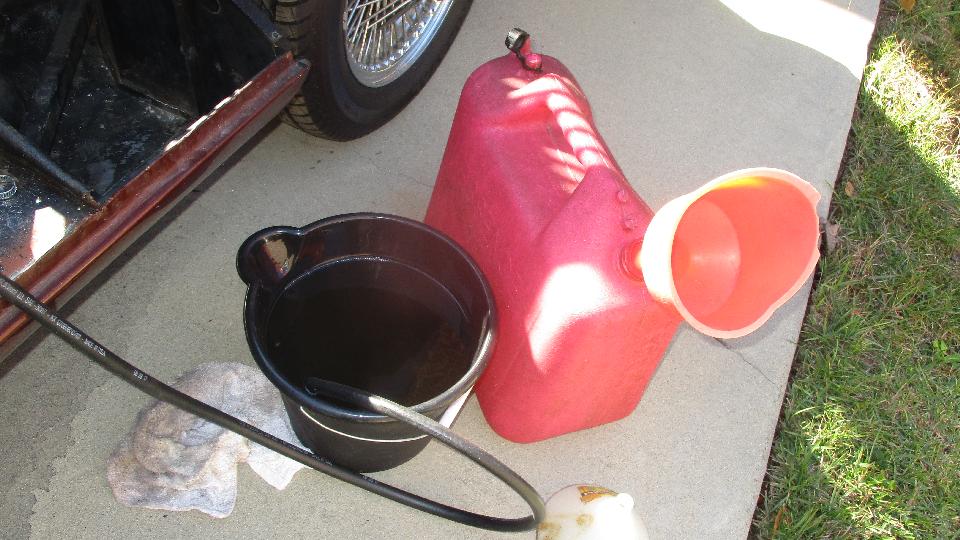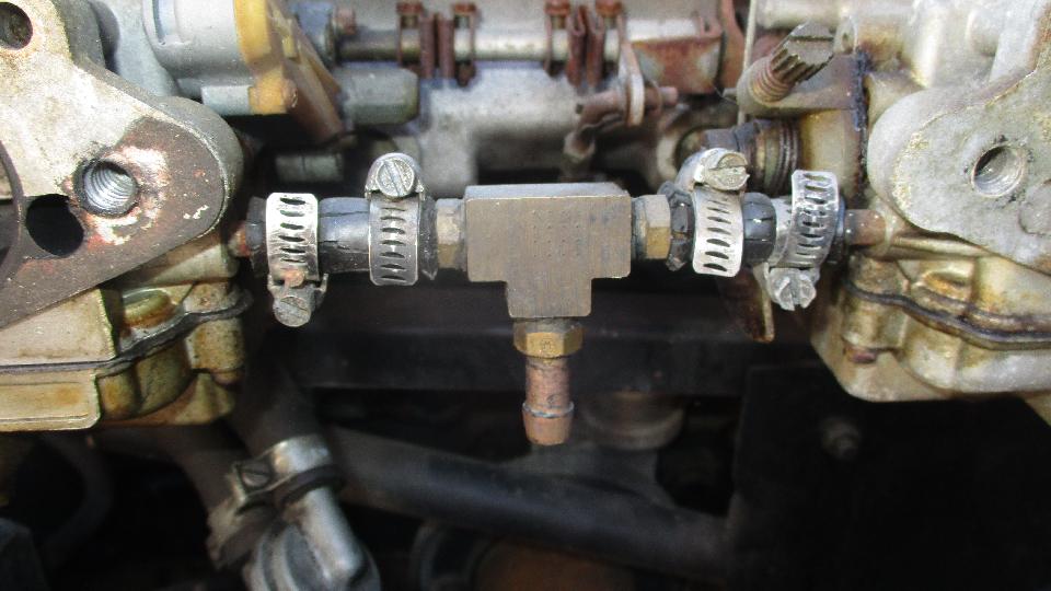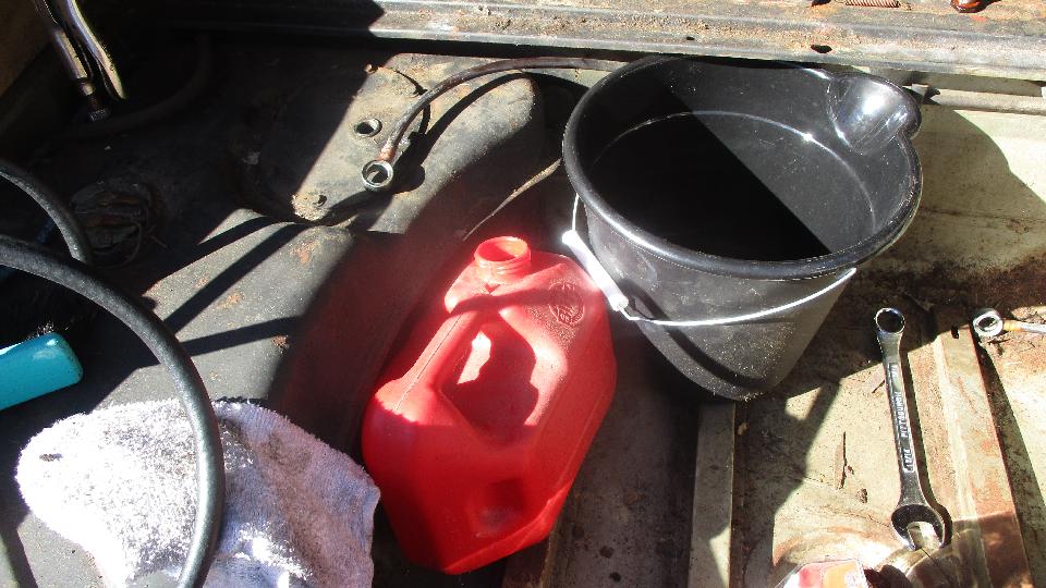 We dressed the plastic pipes back into place in the boot space, then took the bucket and a hose up front to pump six gallons of stale fuel out of the tank. Noticed rotten hoses on the T-connector at the carburetors.