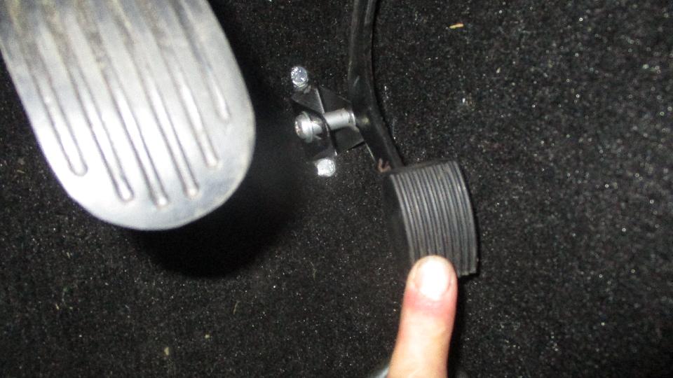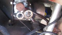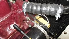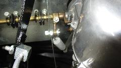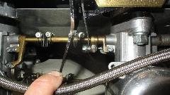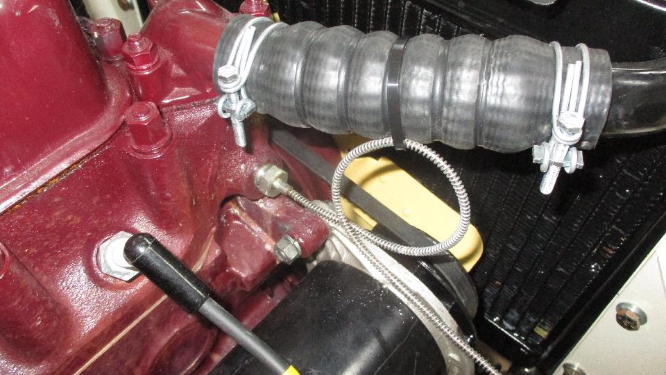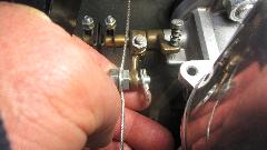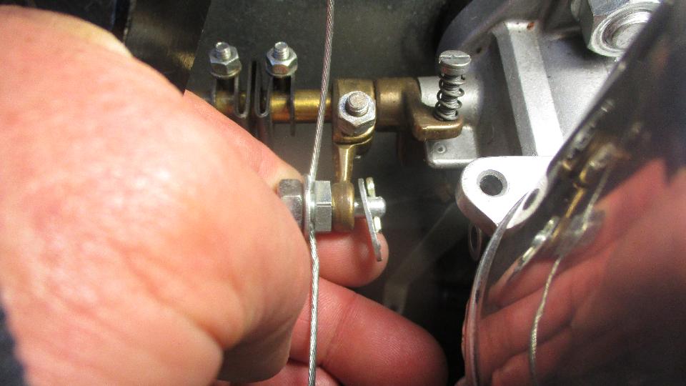Notice above right that the new bracket for throttle cable has the welded stop piece in the wrong location, so it does not hold the cable anchor in correct orientation. Another adjustment put the part upright for straight pull on the choke cable (below left). Proper adjustment of the pedal stop allows the carburetor to pull full open without undue stretch or stress on the cable. And we put a strain relief loop in the temperature sensor pipe and tied it securely to avoid undue stress on the pipe as the engine vibrates.