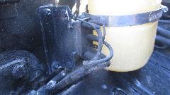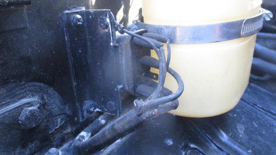 Then the not-so-much fun began. Jack up left side, install two jack stands, crawl under, find slave cylinder on right side. Rats. Stands out, jack down, other side, jack up, stands under, then can work on the slave cylinder. Slave cylinder has a short metal pipe going to a bracket on the engine sump where it connects to the flex hose. Unfortunately the bracket was not bolted down, so the metal pipe would flex. Bad, bad, bad. Vice grips on the bracket, unscrewed pipe nut from hose (drip, drip).