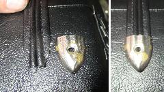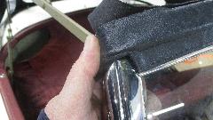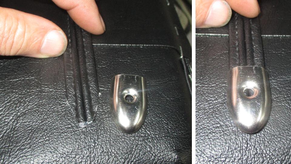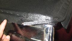 Time to install the Hidem strip in front. Here we have a design change in the metal trim cap. The first one is an earlier part from my car (slightly tarnished), the second one a "modern" part from Moss Motors (like we're not supposed to notice the difference). The larger later issue part leaves a significant gap at the open and, where the earlier smaller part fits better. We both like the smaller part, so this will be left off while Ron goes looking for the more original parts. Meanwhile we went ahead and installed the Hidem strip.