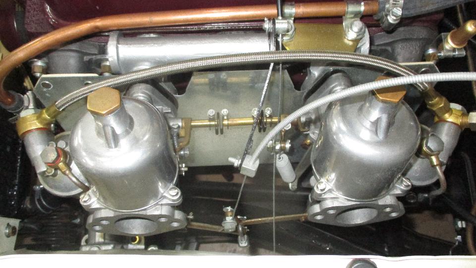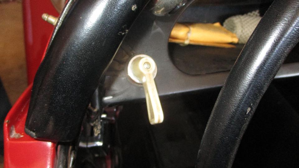 While the top installation was on hold we gave it a tune up, adjusting choke and throttle linkages and the pedal stop. The throttle pedal had an annoying hitch in its git-along, which was due to a misadjusted throttle arm on the carburetor shaft. The arm was way too low so the cable was pulling almost in line with the arm, requiring lots of force to get it moving. Easy adjustment to rotate the arm a bit. While reorienting the throttle arm, I found a lot of slop in the joint between the cable stop and throttle arm. While adding some flat washers to take up the excess space, I also relocated the tab for attaching the return spring to same side of the arm as the pull cable. Collectively this reduced slop in the joint considerably, and should also reduce wear on the throttle shaft.