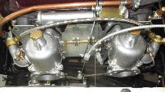 A few minutes later we had fresh hoses in place, switch on, ticky, ticky, ticky, then no ticking, fuel in the filter and the carburetors, no overflow. Air pistons in the Stromberg carburetors moved freely, no sticking, oil in the dashpots, dampers working properly, all good. On to the starter motor problem. Switch on, click. That was nice. Switch off, click. Switch on, click. Starter relay working, so look for wire from relay to starter solenoid. Found wire disconnected from relay. Doh! Reconnected wire, and it cranked, tensions and expectations were rising. Reconnected wire to ignition coil. Pulled full choke, cranked it over a few times, first a pop, then a sputter, and then it was running. Check the look on Elliot's face.