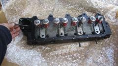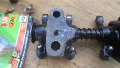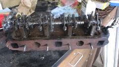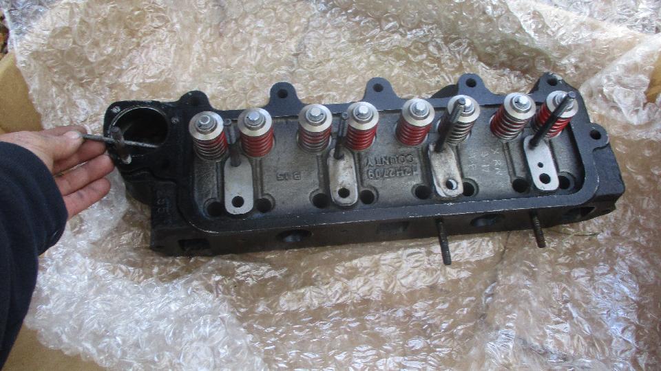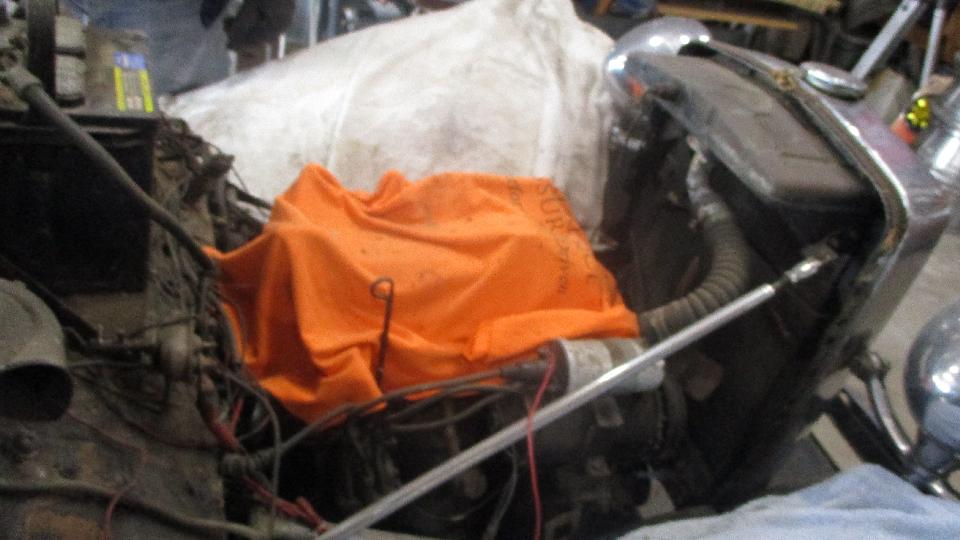 The replacement cylinder head was a pre-1968 model with no air injection ports and in-line oil supply hole for the 4th rocker pedestal. Solution for this problem was use a little JB Weld to plug the slot on the bottom of the fourth pedestal. Inside the water jacket we found what looked like a piece of welding rod. This is not the first time I've seen this. Some years ago I found a similar long steel rod inside of the cylinder head of an Austin Healey 3000. This one was a lot easier to remove. We had a 10 AM start, then a three hour mid day break when Bill had something else to do. Back to work in mid afternoon, by the time dark fell we had it back together and running for a couple minutes (no water in the cooling system yet).