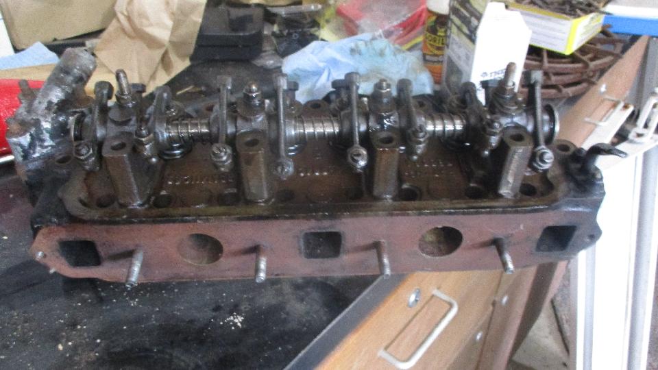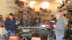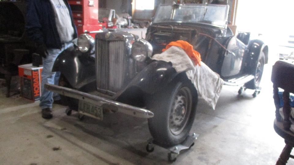 Gary has an MG TD with MGB 1800 engine that has not run for decades, but reportedly did run when parked. Intake ports had accumulated a lot of dirt, so the head was removed for cleaning, and needs to be reassembled. Intake and exhaust manifolds and carburetors are from MGA, which seems to be okay. We had some discussion on carburetor linkages, and which fuel needles would be appropriate for the late model 1800 engine with early 1800 emissions configuration (stripped). Should be easy enough to get it running again, but there is otherwise a lot of work to be done to get it roadworthy, and lots more work to make the body and trim look nice (think restoration).