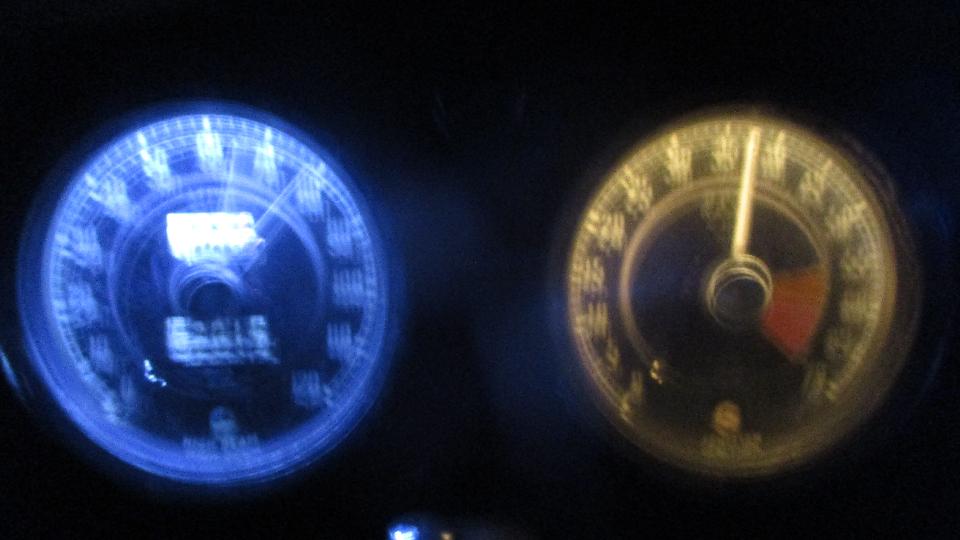 and the speedometer needle wavering, but it tells a story. The speedometer on the left is lit by an LED lamp, while the tachometer on the right is lit by an incandescent bulb. The previous LED crapped out after almost three years use (installed December 5, 2014). I think we are all supposed to believe that LEDs will last forever, but maybe not.