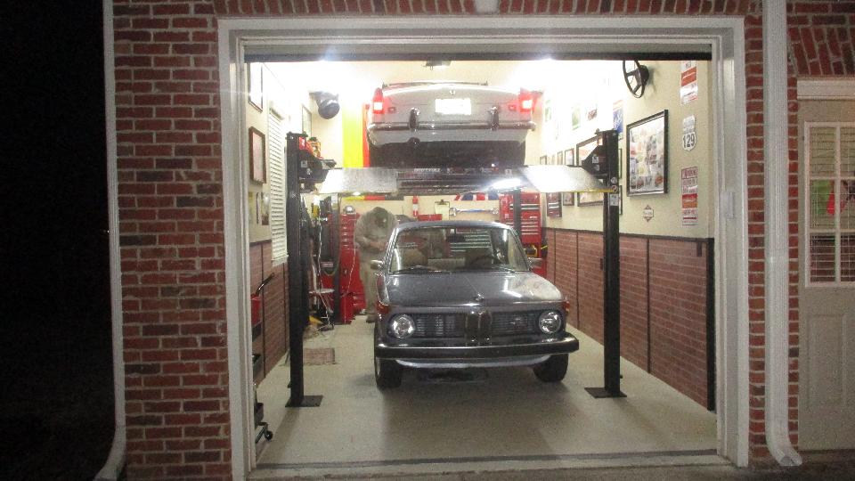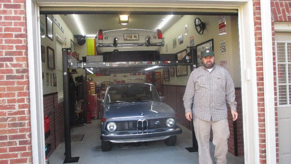 This afternoon we had an appointment with our old friend Keith Farley in Canton, GA (north of Atlanta). If you have been following our travels for the last few years you may recall that Keith used to live in Columbus Georgia, and he is the current caretaker of (one of) "Grandpa's MGB". Today we get to tinker with it again. The current issue is a brake failure lamp shuttle switch showing "on" which should indicate a brake hydraulic failure, but also staying on after the car is parked and ignition is switched off. Keith had procured a couple shuttle switches for spares to work with, and it didn't take long to get the MGB down for access. Of course you did notice the double stacker lift in his shop space.