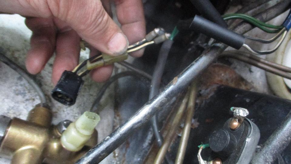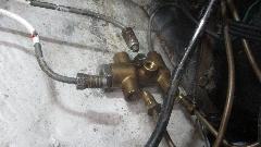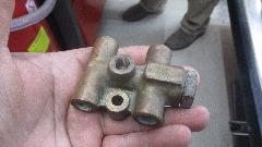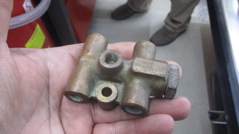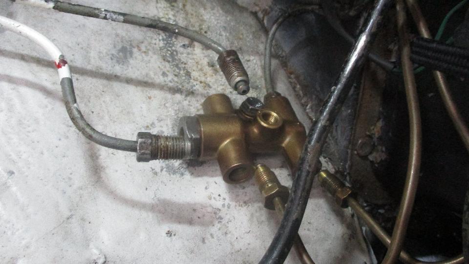 Having disassembled both spare shuttle valves, we pick the best of the two, cleaned up the inside bore, installed new O-rings and reassembled it. Then to install it we had to remove those pesky air cleaners, disconnect all of the brake pipes, and unbolt the shuttle valve from the inner fender. Once completely reassembled we had a little problem with the connector pigtail, until we figured out how it works. Both the wires are black and white indicating switched to ground. Inside the top of the white nylon switch the two terminal pegs are electrically connected together as one. When the switch is actuated, the wires are switched (connected) to ground on the body of the shuttle valve. That makes the indicator lamp on the dash light up. The second wire comes from the press to test switch. When you press the switch it also switches to ground making the indicator lamp light up to prove that it works (that is, press to test). When it didn't work as intended, electrical tests indicated that one of the terminal pegs was not making contact to the pigtail. The expedient solution was to connect the pigtail wires together so that only one of the terminals actually needed to make a connection.