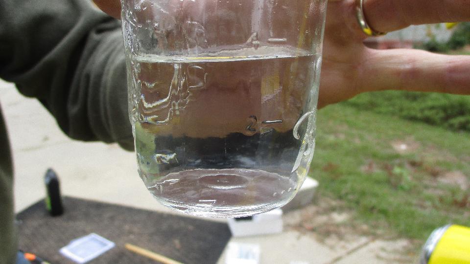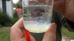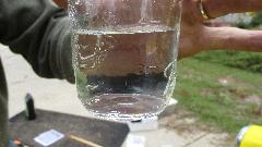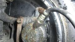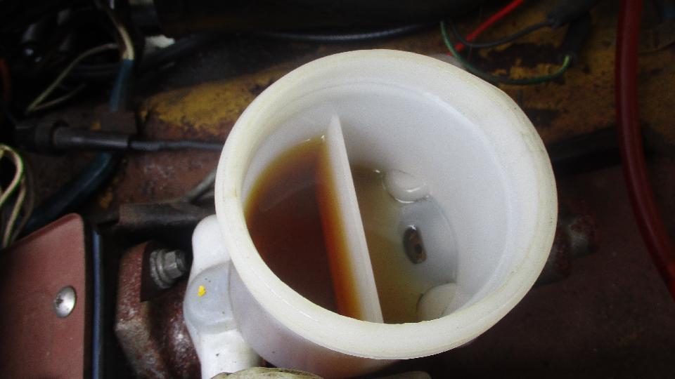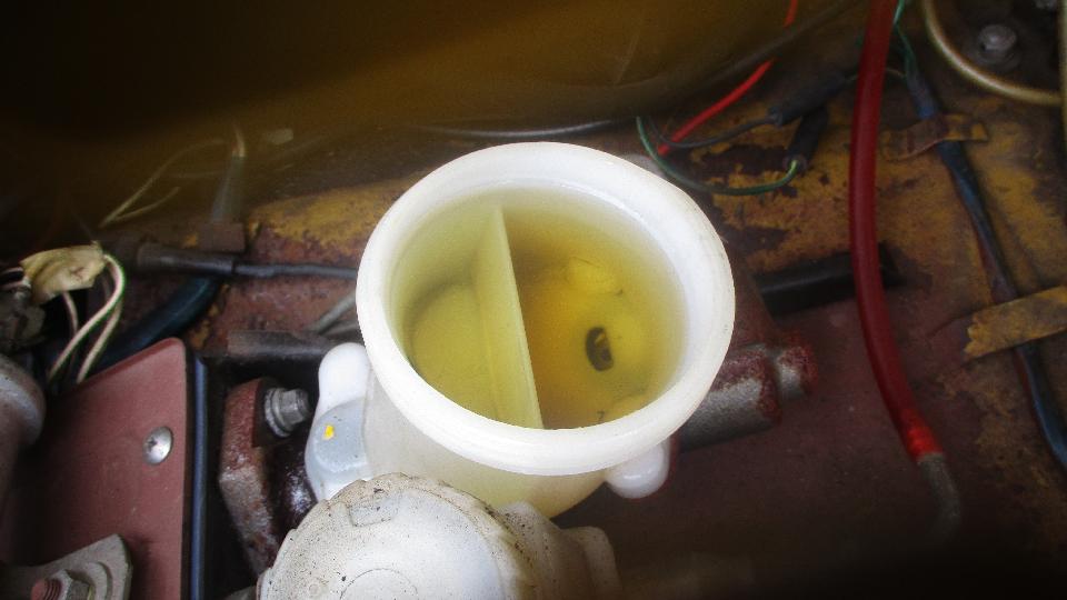 there's the first problem. While front brakes to 2/3rds of the work, air in the rear brakes will make for a spongy pedal. And the fluid looked kind of murky, having ingested some moisture over the past couple years. Fluid type was unknown, so we took a small sample and dropped it into water. It immediately mixed together making the water murky. The fluids did not separate out of solution, so we knew it was glycol based (DOT-3 or 4) and not silicone (DOT-5). Off to the store to pick up a quart of DOT-3.