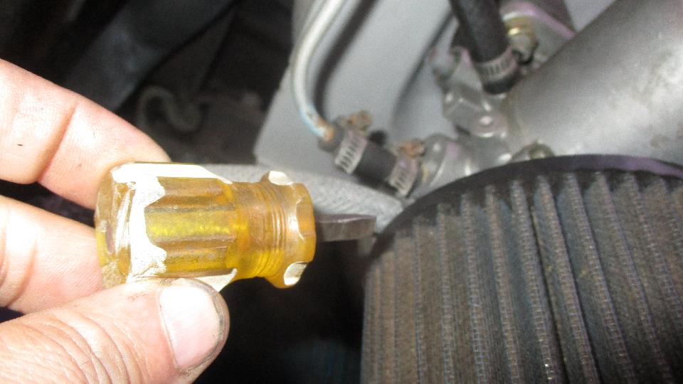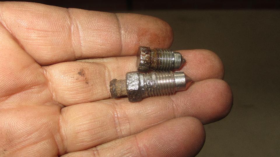 When bleeding the brakes we ran into another problem, hydraulic leak at the right front brake caliper. At the top of the caliper there are two possible positions for bleed nipples. These contained one bleed nipple and one plug. The plug was leaking, and no one had touched it. Tightening the plug left it still leaking. Problem there was the plug turned out to be too short and was bottoming out of the hex head rather than sealing on the tip end. Not having another (longer) plug in hand, solution was to use another bleed nipple to plug the extra port.