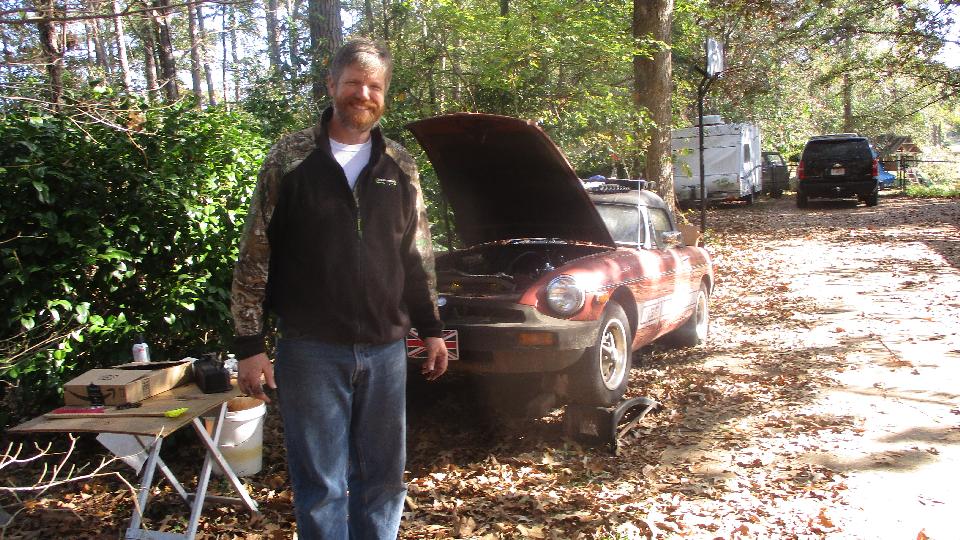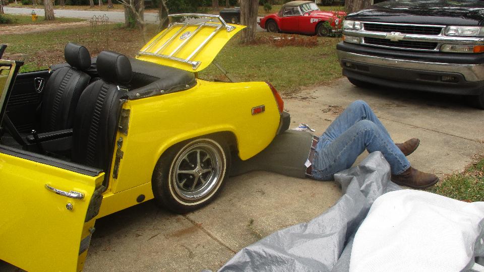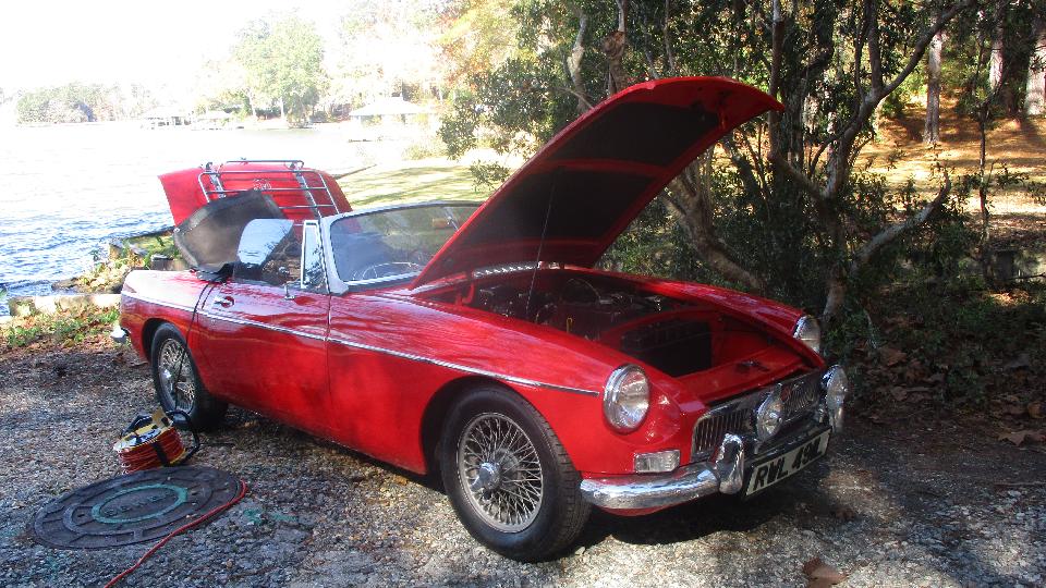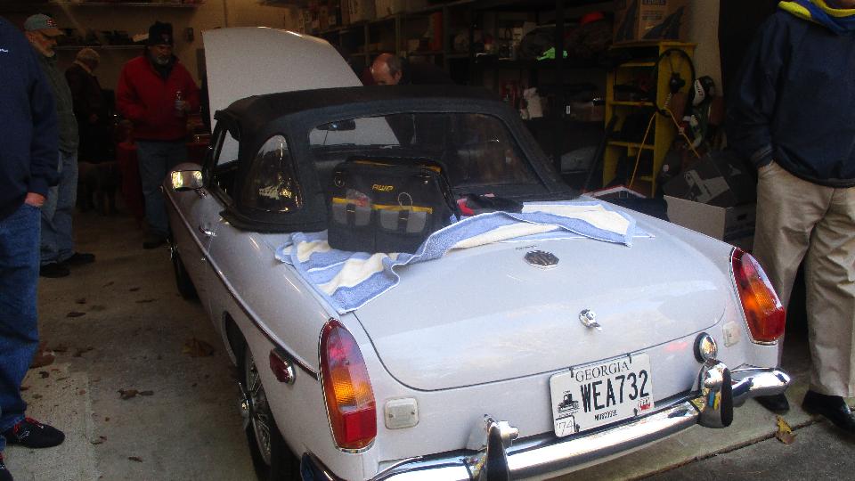 Had a tech session today with the Facebook group Brits In The Valley (Chattahoochee River Valley). This is the group that sort of materialized out of a few friends after our first passing this way three years ago revived a few British cars. We like to think of it as our second club or home away from home, so we drop by whenever we can. Three years on the group has grown to something like 85 members. Hey, when you get it right people come. Today we were meeting at the home workshop of Larry Stephens in Columbus, GA. We were a little early, so just a few cars there when we arrived. The red MGB belongs to Jim Walton, one of the founding members of the group (along with Keith Farley from two days earlier). Apparently nothing wrong with Jim's car, just on charge.