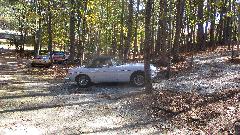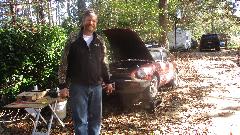 Figure the clutch hydraulics should be bled too, but that bleeder is nigh impossible to reach without jacking the car up. So we emptied the clutch reservoir, washed it out, and refilled with fresh fluid. Tom has a plan to use a friend's hoist later to flush the clutch fluid. For now they are happy as a lark that the car is back on the road for the first time in nearly a year. Rather short day, done by mid afternoon, time for a late lunch and friendly chat. Then heading farther south late night.