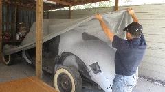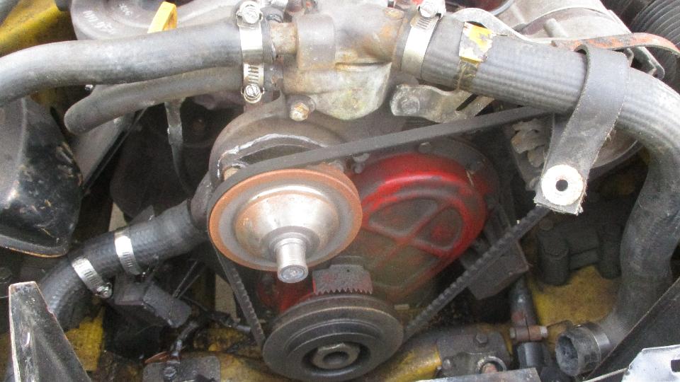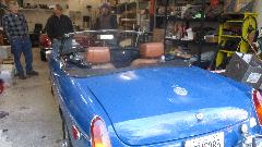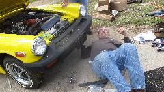 I last saw this car a year ago when it dropped in for a visit at Bill Waller's place. Since then, the Midget has not been running for the past 11 months due to problems with the water pump and cooling fan. A local mechanic had replaced the water pump but had some problem transferring the thermal clutch fan assembly from the old pump to the new one. After it was driven for a bit the fan clutch came loose from the water pump, and the fan damaged the radiator (which was subsequently repaired by a local shop). Apparently the prior mechanic moved away, and the car sat with no fan, so no driving. They finally gave up on the thermal clutch arrangement and bought an electric fan, which we would install today.