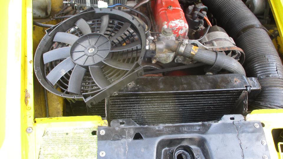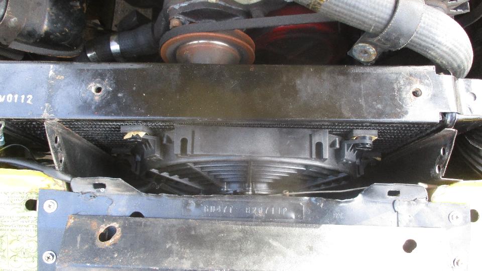 Tag on the fan said MC109K-F 12-volt, Made in China. That would be 10-inch, medium profile, reversible “S” blade fan with 90 watt motor. Specification says 5.1 amp current draw (not 7.5), so maybe it's running at somewhat less than the maximum motor output. Or if it's 90 watts at 17.5 volts peak, then maybe 70 watts at 13.5 volts (or there about). We had to reverse the fan blade to convert it from puller to pusher, and determine electrical polarity to make it turn the right direction. There were multiple trips to the local Pep Boys for Lucar terminal splitters, colored wire, fuel filter, and antifreeze, while I was regularly pulling minor bits out of the magic trailer. We finally wired it to the "green" fuse powered from the ignition switch, so the fan will run all the time the engine is running. While I'm not worried about the fuse, I may be worried about putting an additional five amps through the ignition switch, but I tend to try the simple path first.