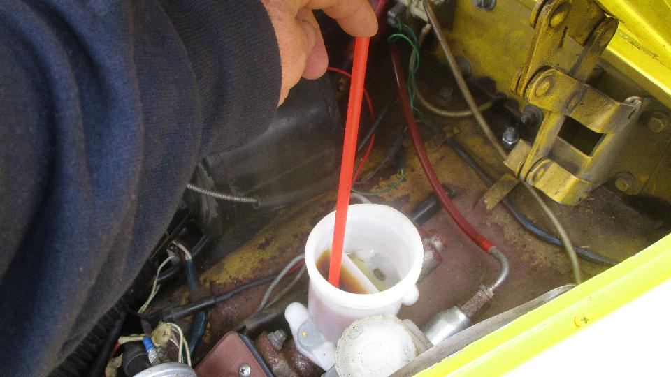 Standard fare bleeding, remove old fluid from the reservoir and fill with fresh fluid. Open bleed nipple, stick a small hose on it, hold hose in a pot with finger over end of hose as a check valve, and pump the pedal until any air is removed and fluid runs clean. Repeat for all four corners, refilling the reservoir as required to prevent it running dry. A bit of grunt work, but in the end we had firm pedal and good working brakes. Go ahead and take it for a spin. Oh, by the way it will run better if it has fuel in the tank, so find the nearest gas station and fill it up.