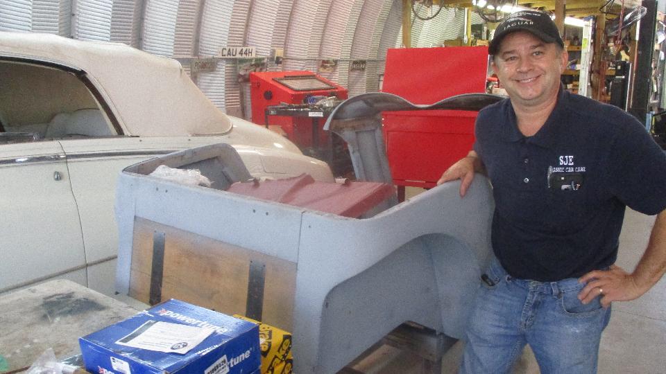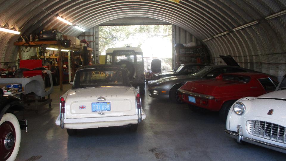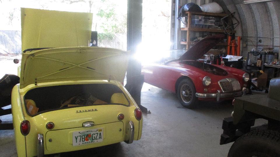 There was a Triumph Hearld, a couple TR3, a Lotus Europa, a larger newer Jaguar, an MGA just coming out of hibernation, and an old Jaguar (MK-5 maybe). Business is good, busy, busy, busy.