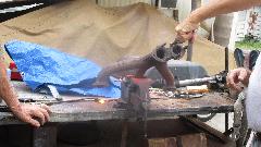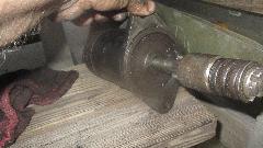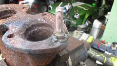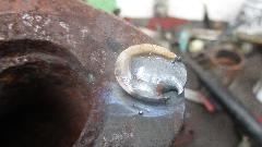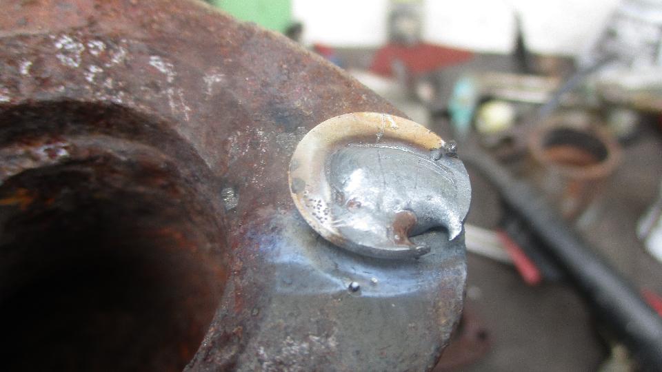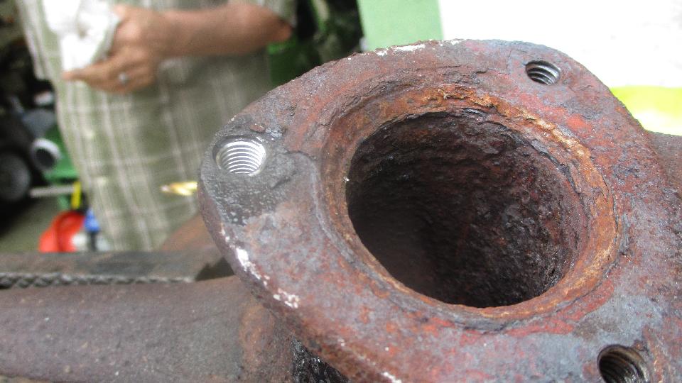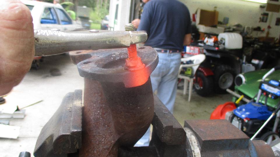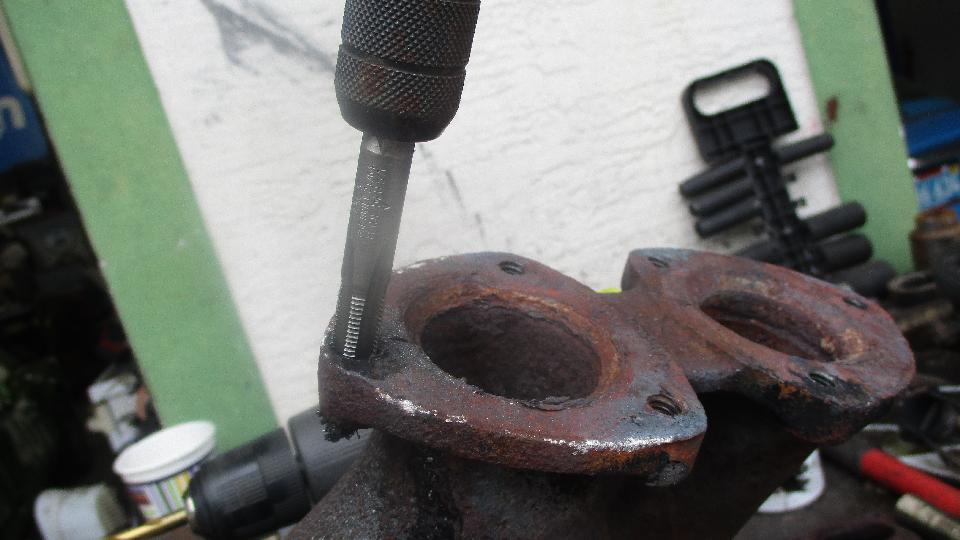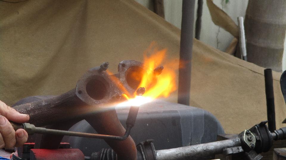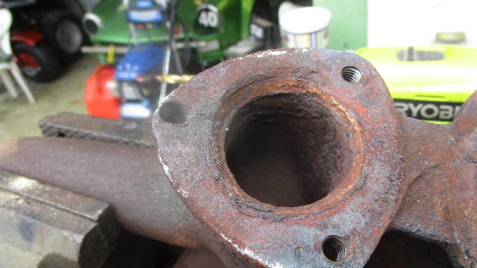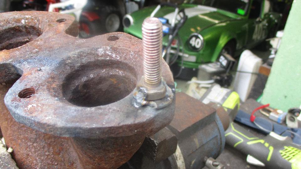 Then it was time to repair bottom studs in two MGB exhaust manifolds. In general, heat the iron flange with a torch, and unscrew the old stud with Vice-Grip (standard stuff). For one stud that was broken off flush, plug weld a flat washer, grind it flat, weld on a bolt, heat the flange and unscrew with Vice-Grip.