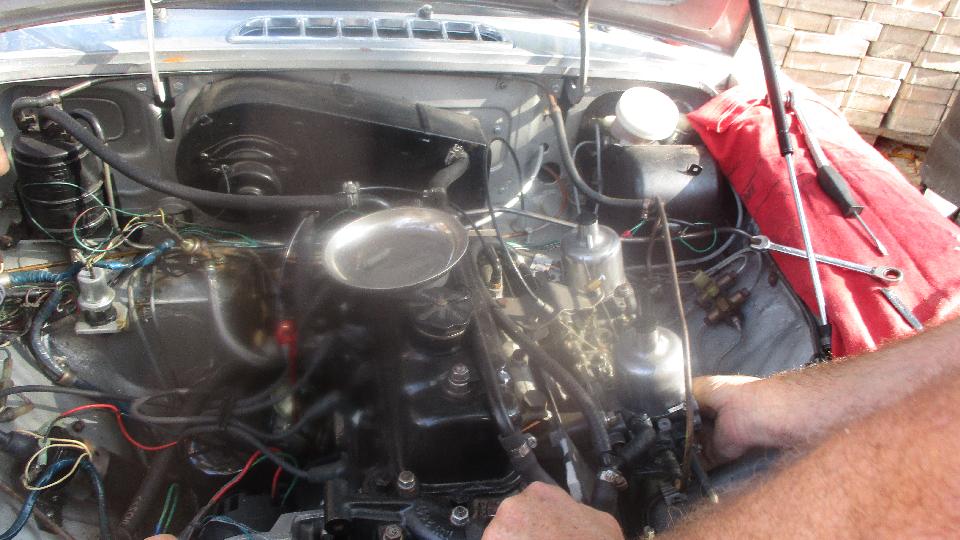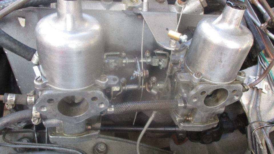 First was the silver MGB left over from last week, the one with the sticking throttle valve in the rear carburetor so it wouldn't idle. Off with the air cleaners, some cables and mounting bolts, and remove the rear carburetor. Loosen screws in the throttle shaft to realign the throttle plate, square it all up, re-tighten the screws, and get it reinstalled on the car. After a little tinkering for standard throttle adjustment, it was synchronized and idling nicely just under 1000 rpm. Success.