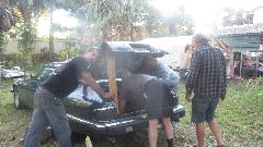 Back to Tech Central in Bonita Springs, Florida. First order of business was a send-off for the blue MGB, getting a new owner today. The car has not-so-nice patina, meaning the re-coat paint is peeling, and you can't hide the rust in the body sills. It did get a new rag top recently, and mechanical repairs to make it roadable, so the new owner will at least get to drive it home.