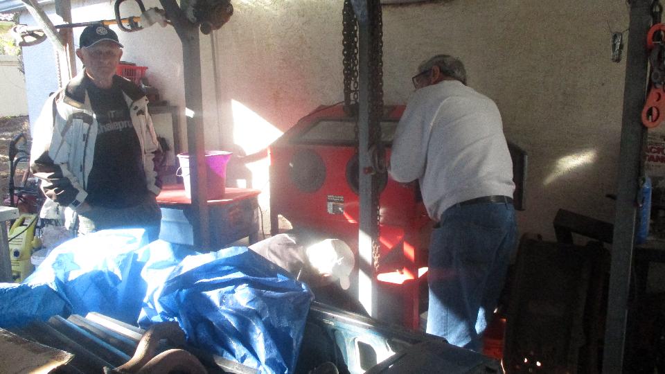 Not having moved very far in the past month, we were back to Tech Central again today. Some guys about to make an alloy side cover for the Austin B-series engine (Z-Magnette/MGA/MGB). Cleaning caked together damp walnut shells out of the sand blasting cabinet. And putting some more time into assembly of the Miata.