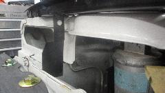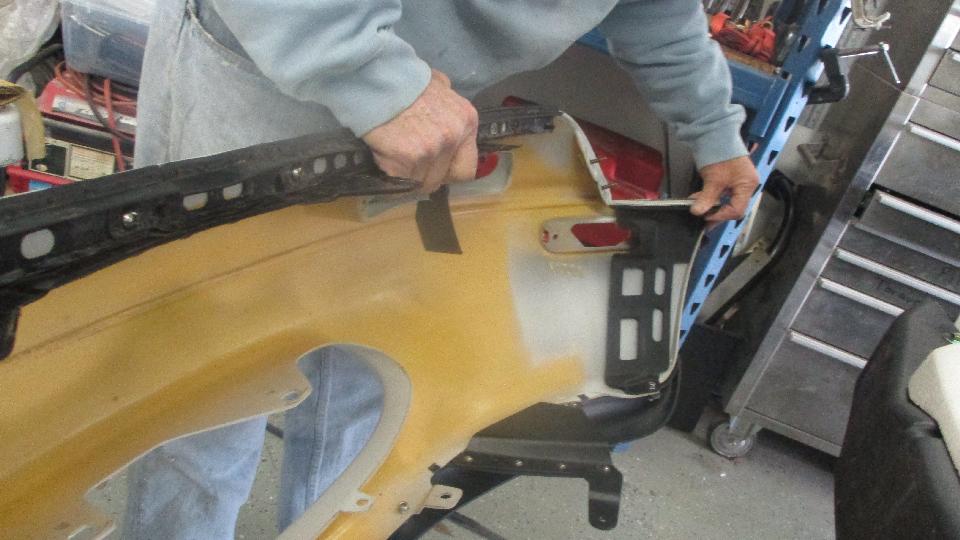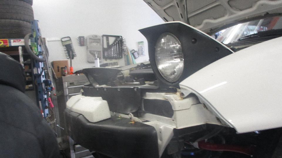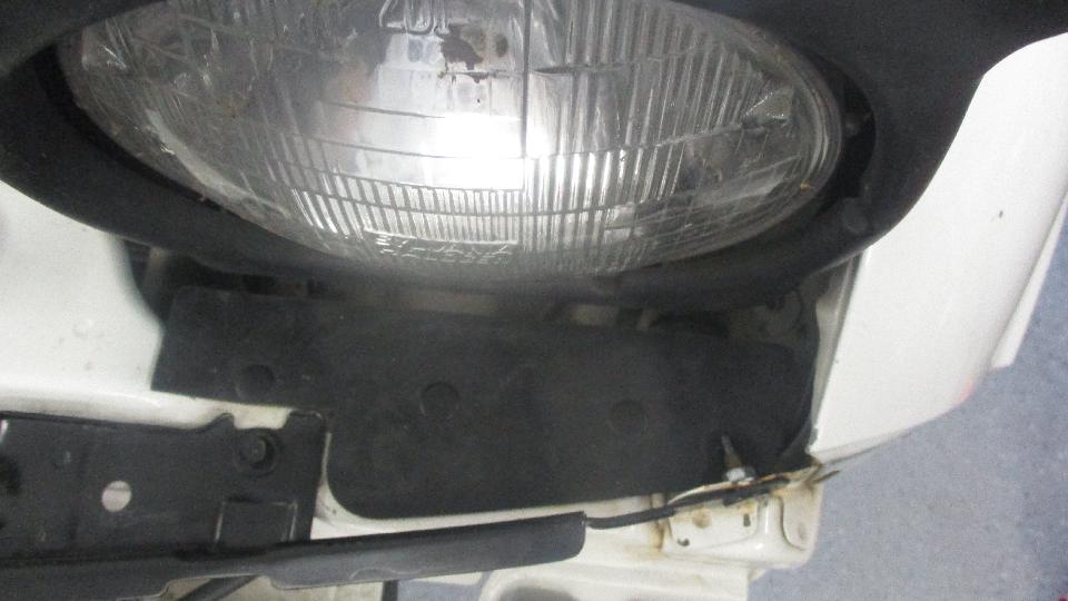 Thick rubber cover in front below the headlight. Pretty sure this is just an appearance item, not a splash guard or air director. Very thin rubber bits attached with plastic snap rivets, we think are air baffles, just not sure why they bothered. And finally turn the thick plastic bumper right side up (note incorrect photo two rows up) so the styrofoam shape saver plug fits right. Yes it is a plastic bumper, intended to crush on impact for energy absorption. One good bump means it would need to be replaced. More on this later.