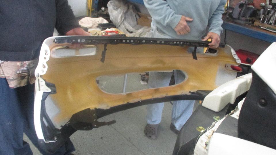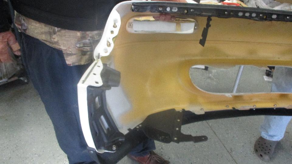 Here we have the plastic bumper (the black part). Mind you there is no steel reinforcement inside of the plastic part, just some sheet metal behind it. Then an inside view of the plastic bumper cover. There is a thin metal bracket along the top edge, and a small metal bracket with two threaded studs high inside each end (close to parking lamp apertures). The black plastic part that looks like a chin spoiler is a stiffener, which includes air ducts (apparently for brake cooling). There are a few Tinnerman fasteners with sheet metal screws to go inside the main air inlet and at the bottom for mounting. Otherwise the whole assembly is held together with plastic push pins, and it may weigh about five pounds.