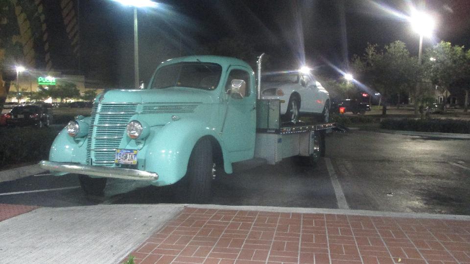 And then there was this rig parked outside. Gotta love it, a vintage International truck carrying a modern car.