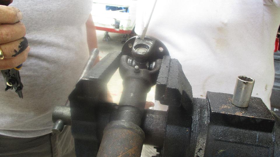 Then we got on with the little chore we missed last week, changing two U-joints in an MGB propshaft. The guys were struggling with the first one for a while, until they saw the proper sequence for disassembly. Then they got the spider in wrong way around with the grease fitting in an inaccessible orientation, so we got to do that one over again. The second one came off without a hitch, and a few people ended up certified for replacing U-joints. The sliding spline was one spline (36-degrees) out of phase, and it may have been that way during many years of past use. But it only took a minute to reorient that properly by hand, no tools required.