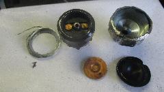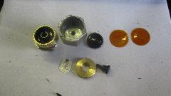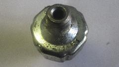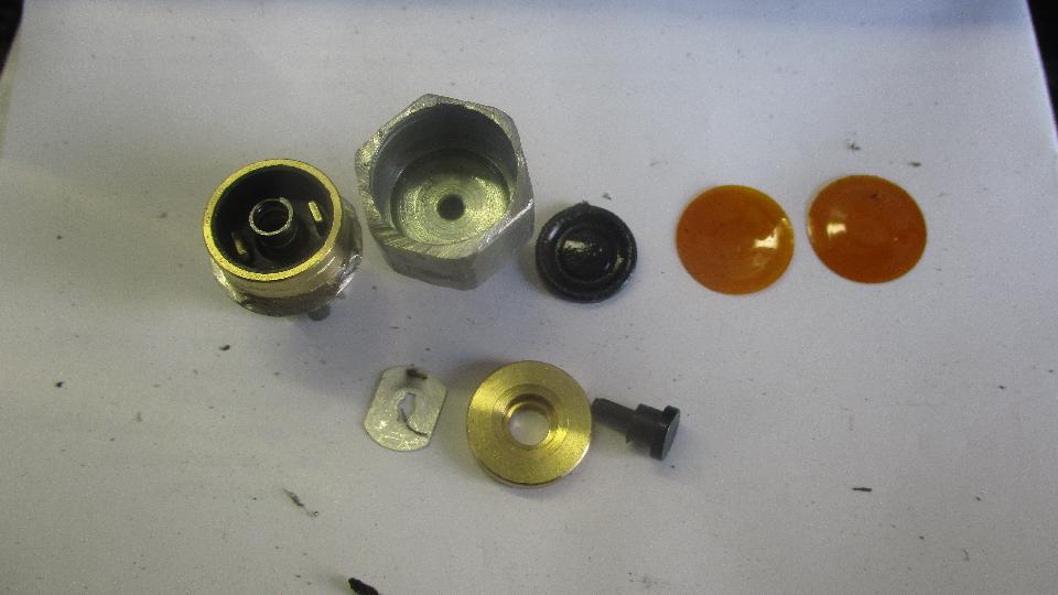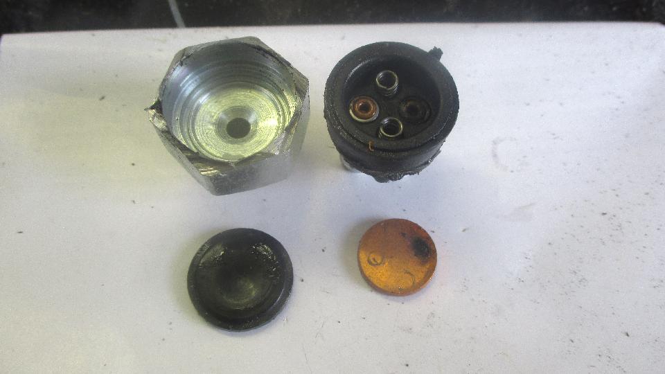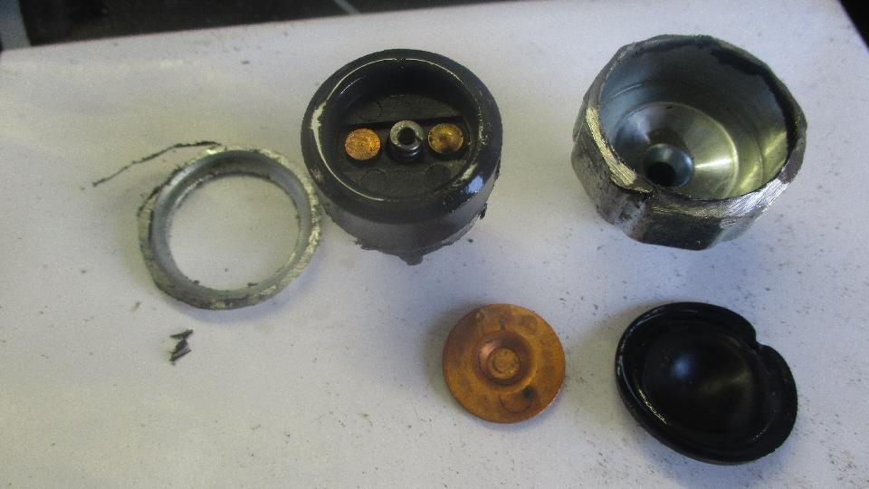 The first one I cut open today was the $23 Harley Davidson switch, made in USA (for all that's worth) purchased November 2014, installed April 1, 2015, failed June 2, 2015 after 8074 miles. Aside from being small, it has the same general (bad) design as other quick failing pressure switches. A rubber diaphragm pushing a spring loaded washer, and slow-make slow-break contacts that will burn with electrical arcing. Here there was an additional thin metal contact plate with some kind of plating, but it didn't help. See the black burn mark on the silver colored contact plate, and the burned mating contact in the cap holding the spring. The two thin orange plastic discs were positioned between the rubber diaphragm and the brass washer. That may be a way to fine tune the pressure requirement for switch actuation.