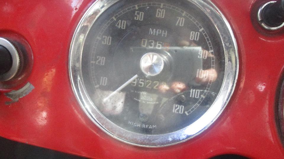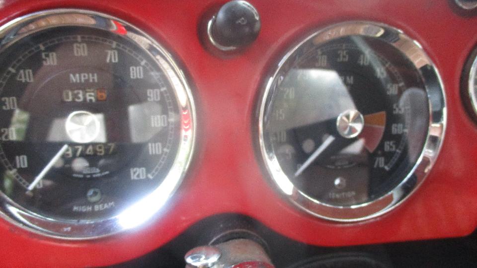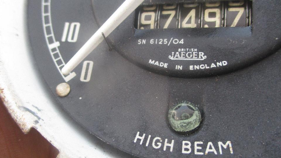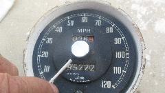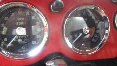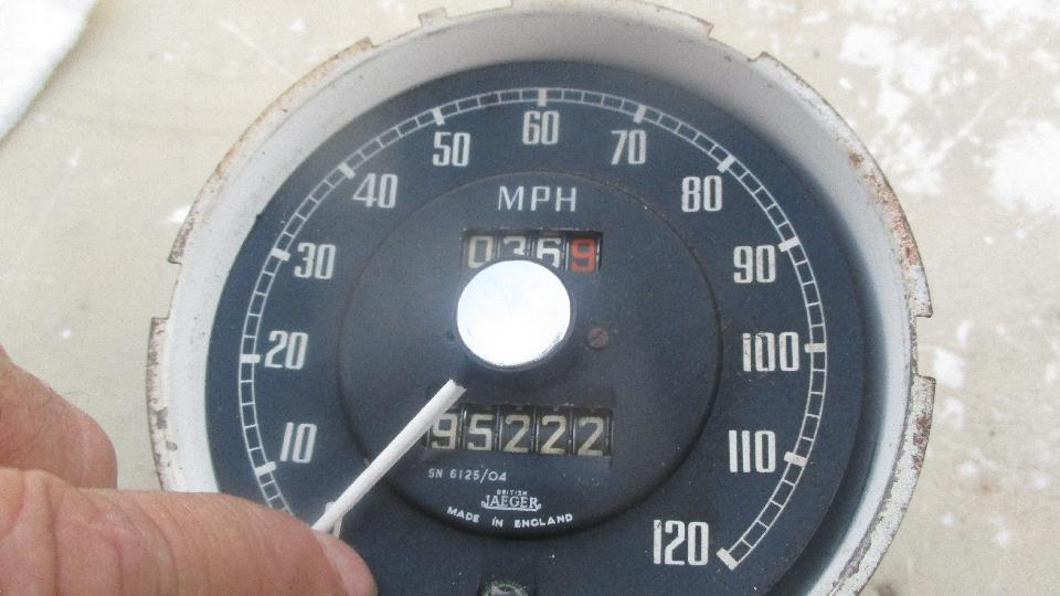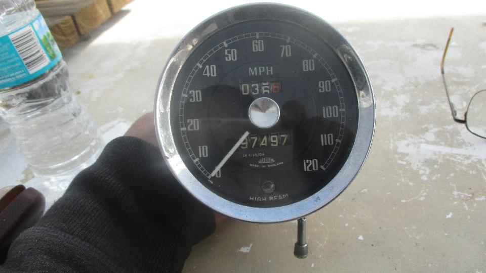 As things were winding down, and we had a little time to spare, I took this as a good time to adjust the miles display on my MGA odometer. I wanted to add on the 2275 miles that was lost when the speedometer drive cable was broken last spring. Reach behind the dash, extract two bulb sockets, disconnect the drive cable, remove two thumb nuts with lockwashers, knock off the ground wire, extract the clamp bracket, and pull the instrument out the front of the dash, all with fingers only, five minutes tops. On a clean table, give the chrome bezel a twist and pull, and pull out the glass along with the light shield ring. It helps that this was apart recently. Note and write down the mileage. Note that there is a little spring wire that the needle rests on. You can depress this wire by pressing on the wire tip, and let the needle swing downward past the wire. Hold the instrument upright as it would be in the car, and note the free hanging position of the needle. You will want to reinstall the needle in the same position with later reassembly.