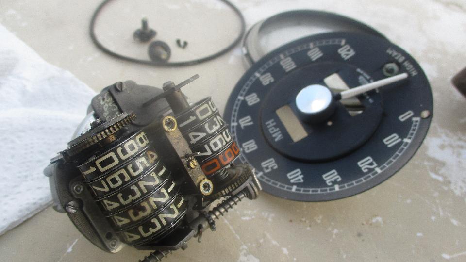 Remove two screws from the back to release the works inside, and then the tricky bit. Because the trip odometer reset shaft restricts motion of the works, one must remove the indicator needle (pry gently under the hub, don't bend or break anything), and remove two small screws to remove the face plate. This would be easier if you could remove the knob from the reset shaft, but otherwise I did a little creative tweaking of the shell around the shaft passage area, and after a bit of pushing and shoving, the works was in hand. For number setting, wind the sprocket on the left a full turn until the ones wheel advances by one. Continue until the ones wheel gets around to advancing from 9 to 0, but stop about half a digit before 0. In the right position this will unlatch the tens wheel, and you can then nudge the tens wheel to advance to similar position, just shy of tripping over to 0. That unlatches the hundreds wheel, which you can turn forward. Keep going until you get to the left most wheel that you want to reset, pushing it up until it clicks into the desired number position. Then move one wheel to the right, and push that one around to the desired number. Continue right in a similar manner until you have the display mileage you want. Easy peasy once you get the hang of it. 95222 + 2275 = 97497. Then put it back in the case, screw it up tight in the back, and reinstall the face plate.