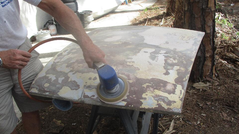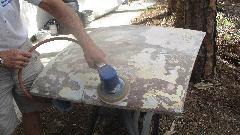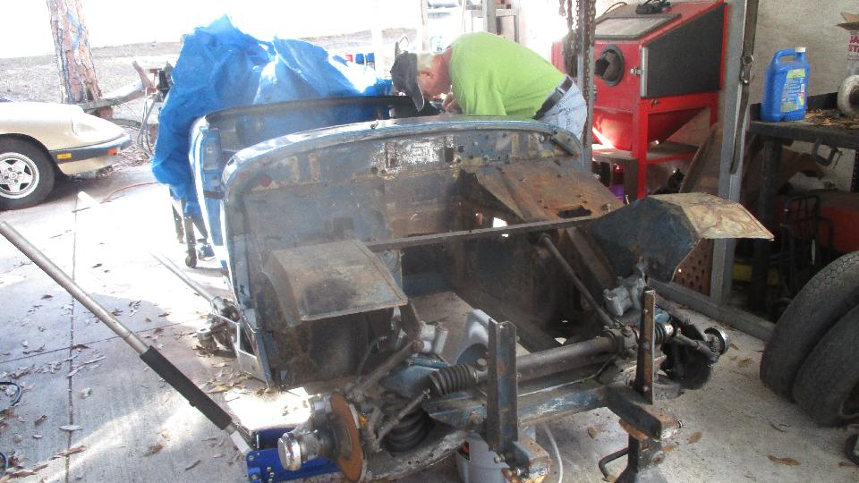 Since we were still in the neighborhood, we toddled back over to Tech Central again. Curious about the MGB missing the bonnet, we found it out back under a power sander. This began with a crack in the paint, proceeding into copious layers of bondo and very rough and somewhat rusty sheet metal underneath. That's going to be a bigger job than anticipated, so at day's end the car was going home without the bonnet.