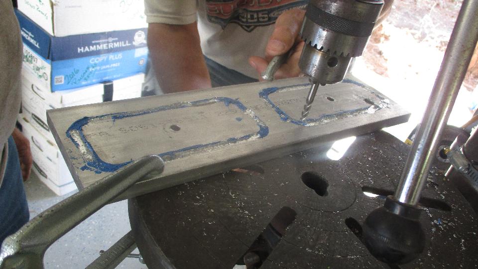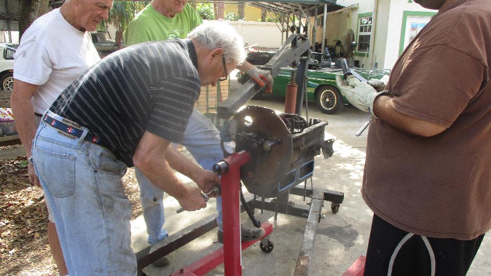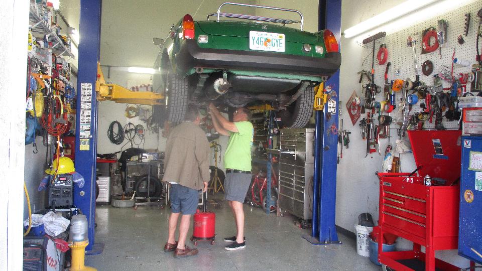 There was a late model MGB on the rack to fix some oil leaks. The overdrive solenoid cover was removed from bottom to replace a gasket. Then the solenoid fell out, and a few of the guys were groveling around under things looking for the tiny ball bearing, moving tool cabinets to sweep up the floor. In the end the little ball wasn't missing but was still hiding up inside the overdrive unit. But it was nice to have the garage cleaned up. In the next bay work was progressing (slowly) on the one-piece tappet cover for MGB. Struggling to use a milling cutter in a drill press with slightly wobbly spindle, but being retired allows plenty of spare time, so they are persistent.