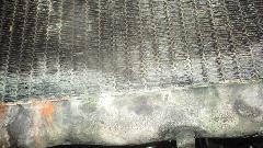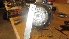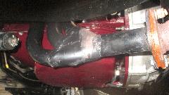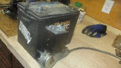 Noticing some odd tread wear on the RF tire, I lined it up straight to site down the sidewalls. Looks like about two degrees negative camber, not intentional. Hard to see, but also looks like a slight banana bend on the swivel pin. Probably not enough to account for all of the camber error, so suspect also a slight twist in the frame. This is the sort of thing you want to catch early and fix before getting too far along in assembly. There was the nicely re-cored tube-type radiator that took a big bite on first start up of the test rig. Ouch. Glad I wasn't in the room when that happened, likely inspiring some interesting new colors of language. Must do better mounting brackets before the next try. Well, maybe it will inspire another re-core with original type cell core.