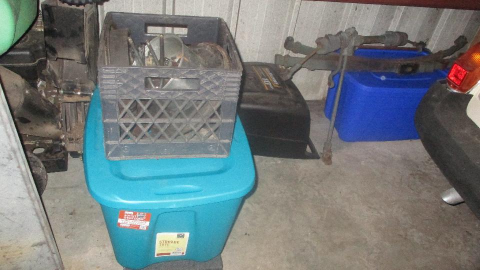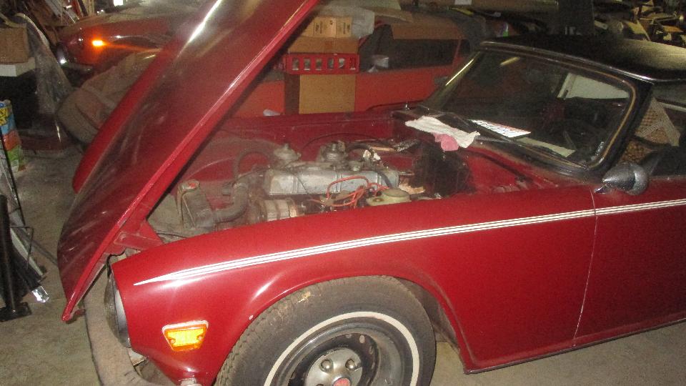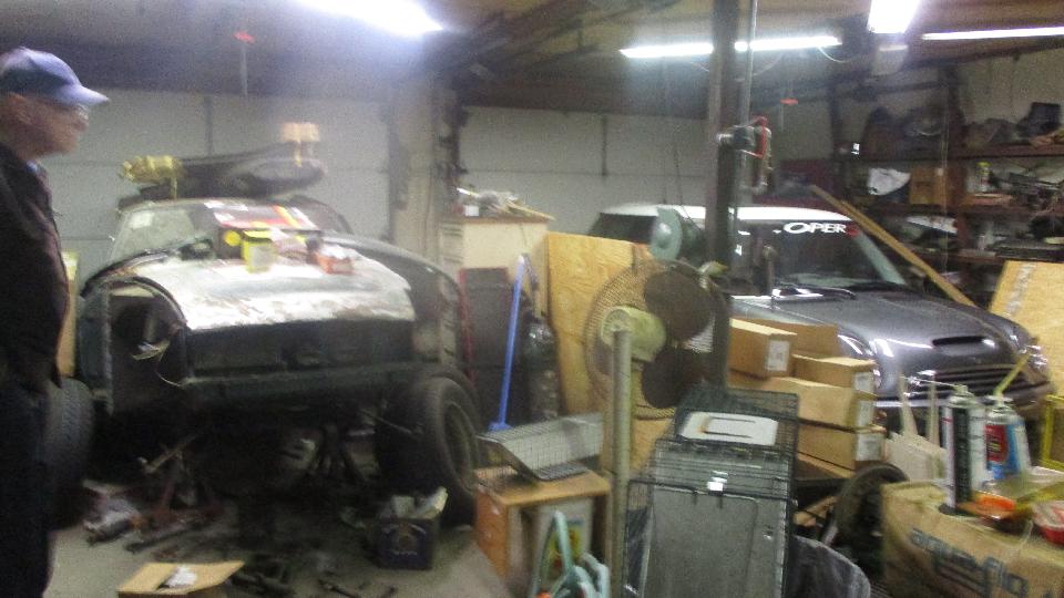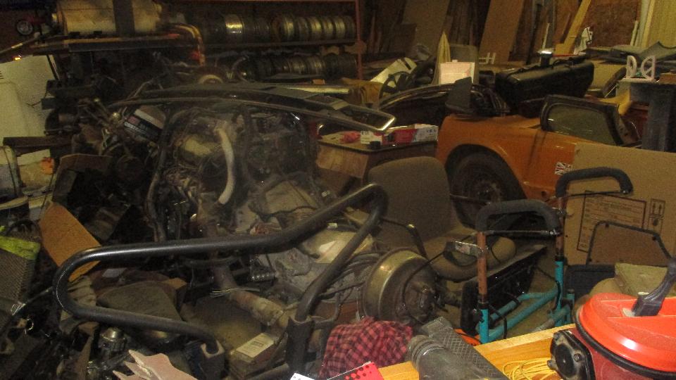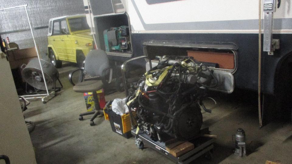 Inside, plenty of work space with a lift. That's BMW M3 soon to be looking for a new home. Just behind it the lady's long standing pet MGB GT. Behind that the little motor home in the back corner (at least 40 feet long). Beside the motor home is a spare VW turbo diesel engine (one of multiples), and behind it sits a VW Thing, low mileage all original and in very good condition. These are some of the 14 vehicles they have licensed and insured (which is why they are parked inside). And there was that TR6 and TR7 tucked in between the lady's MGB GT and the roller home.