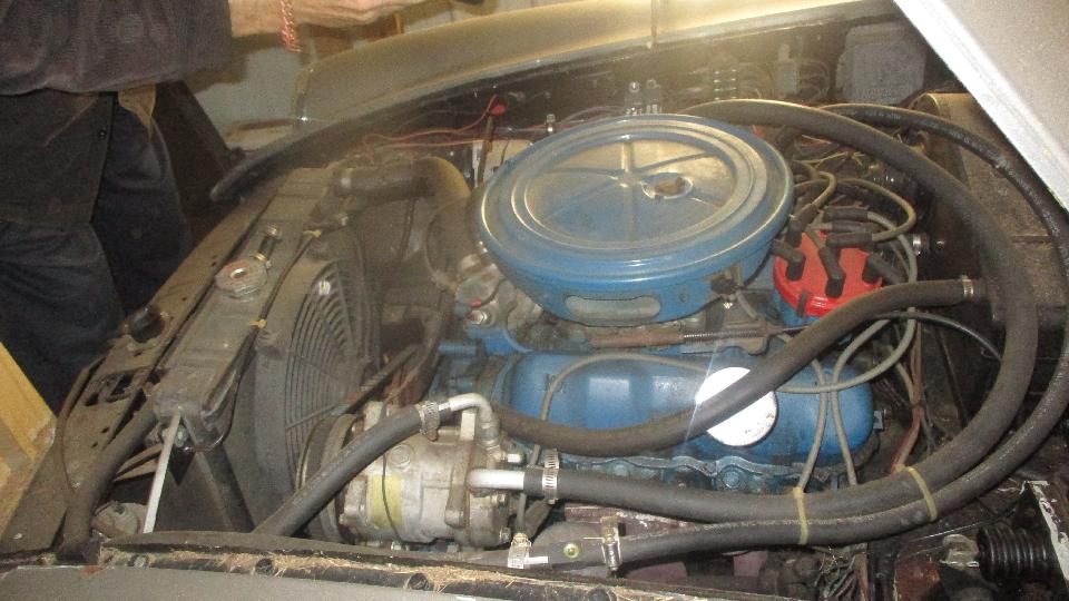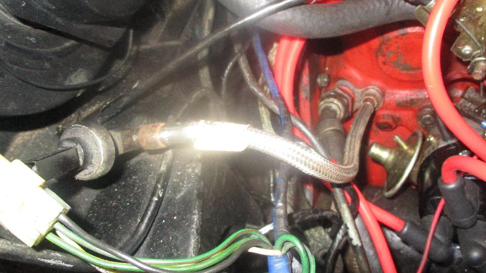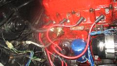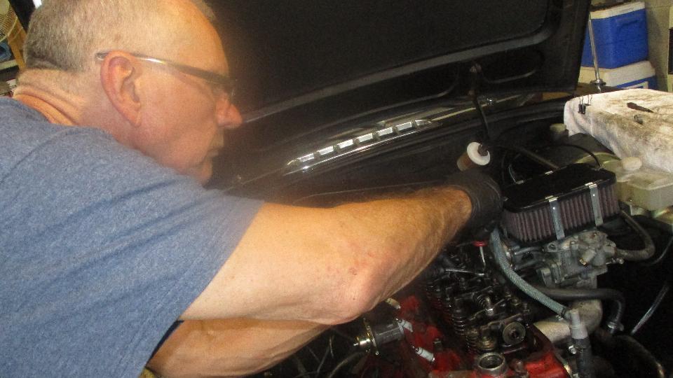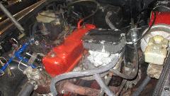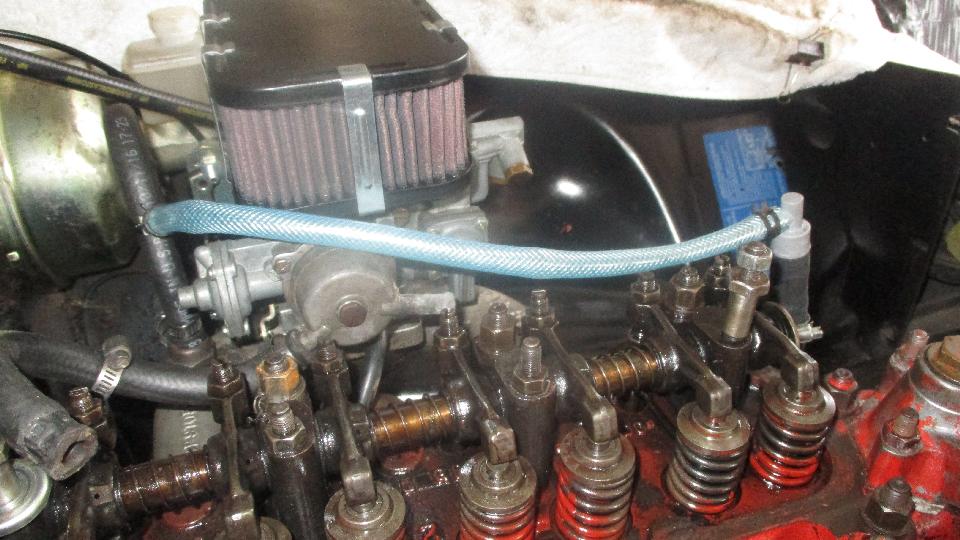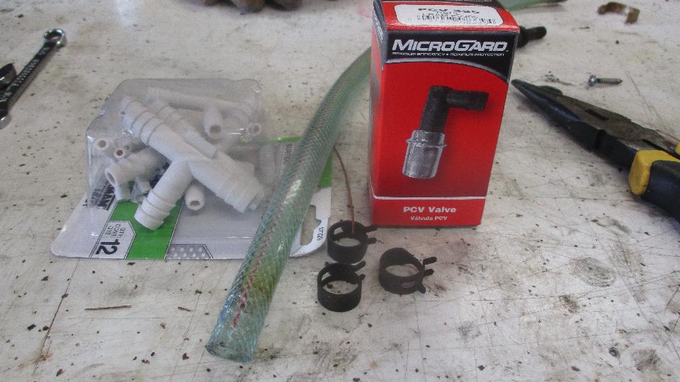 There were a few trips to the magic trailer for miscellaneous fasteners, some discussion about the prior carburetor transplant, anti-run-on and fuel vapor recovery. To avoid the scummy stuff forming in the valve cover, a trip to the parts store to pick up a PCV valve and a few related fittings, and that turned out to be a fairly easy fix. For the curious, that's a MicroGard PCV valve #PCV395 from O'Reilly Auto Parts, replacement for Fram FV395, 1/2-inch on the bottom end and 3/8-inch on the side outlet, plus a 3/8-inch hose Tee.