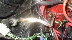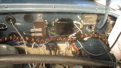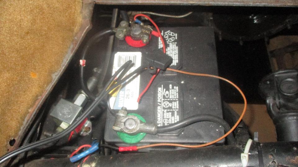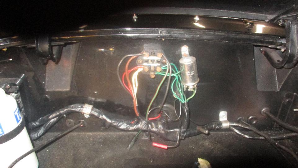 Couple of missing mounting screws, one slightly deficient bracket, but we finally had access to the battery cover and the bits beneath. Quite a lot of mischief in the wiring, beginning with almost all of the harness having the cloth cover stripped off and then covered with vinyl tape. A few redundant wires, lots of mismatched colors including blue and red in the originally white ignition circuits, black wire in the originally brown battery power circuits, a fuel pump cut-off switch that was disconnected. Ultimately the owner conceeded to buy a new wiring harness (and new battery hold down clamp).