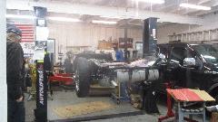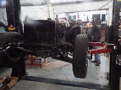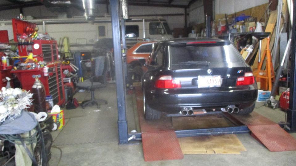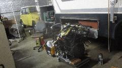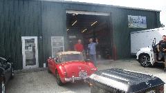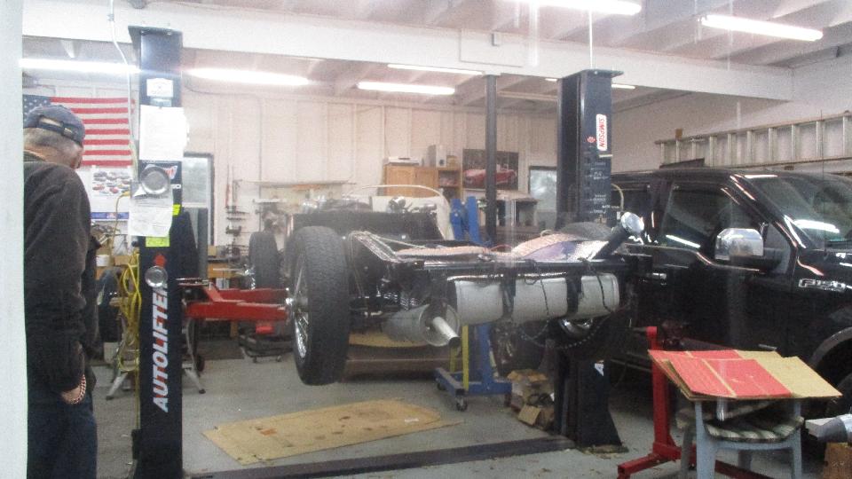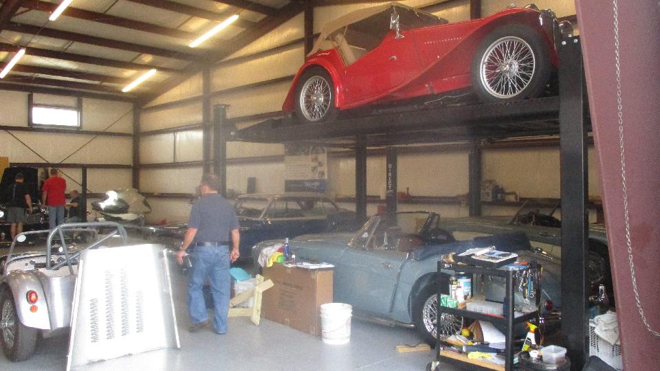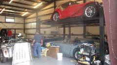 Back to the main bay in front, four drive-on hoists, I'm impressed. The MGB in back we have seen before. Last time was at the car owner's home, impressed by the custom work, coil-over front suspension, independent rear suspension, supercharger, lots of chrome under the bonnet. Less impressed that crankcase ventilation has been disabled, along with fuel vapor recovery and anti-run-on functions. We have intention to get it running, install an oil drain plug, and break-in oil, but stopped when the owner left for the day, may resume tomorrow.