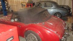 Today we dropped in to visit the "club garage", some leased space that habitually hosts some of the club members cars for service work. Not on our Shops list because it is not a commercial shop, just a hobby home. We have been here before. There is also a "side door" for more shop space around the corner to the left, let's go there first. The red Healey looking car is a fiberglass kit car, likely not worth much, although the large vintage Jaguar is nice.