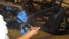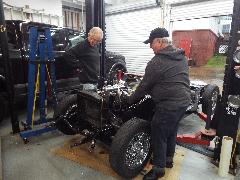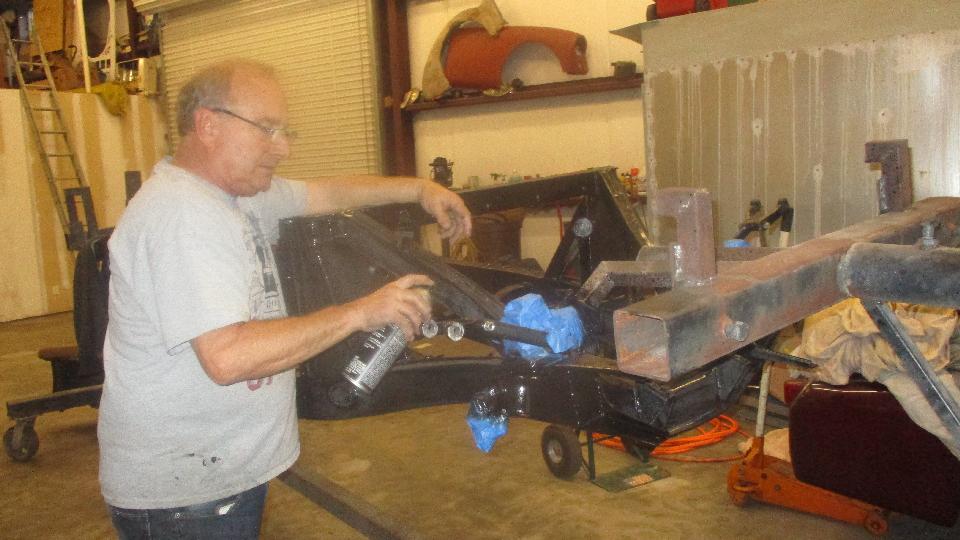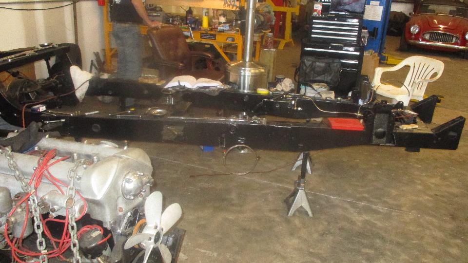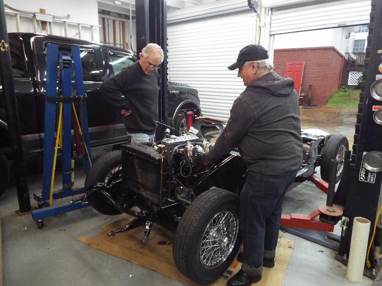 A few feet away an MGA chassis was getting some hand sanding and easy re-spray to change gloss black to satin black (original Chassis Black color). And there was a quick review and a recommendation for Motor Coater high temperature engine enamel, off the shelf in the correct dark red color for MGA and early MGB engines.