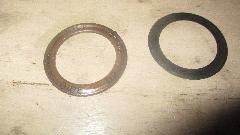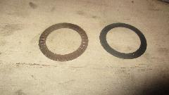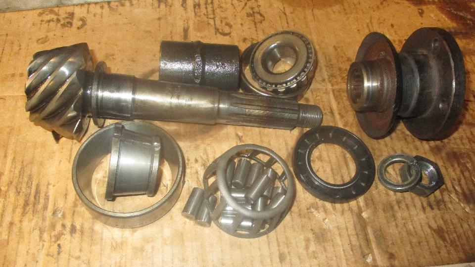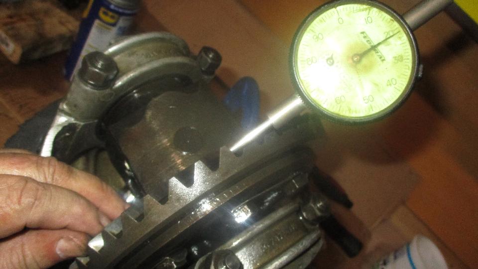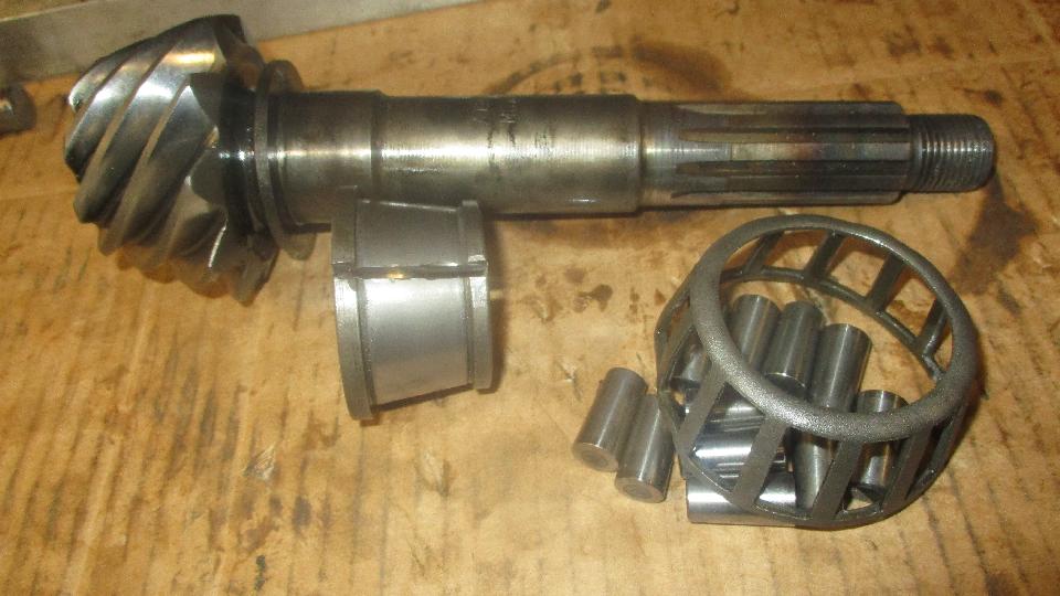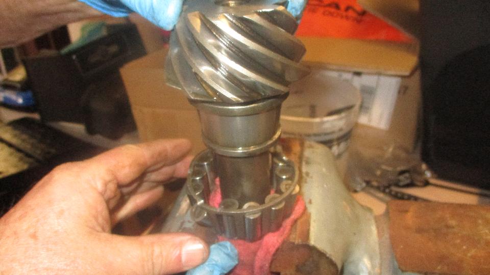 When it came apart we found a 0.060-inch thick valve spring shim being used for a bearing inner race shim, where the shim stack is normally 0.020-in or less (explains a lot). After fiddling with shims for a while we had it down to 0.004" only which is way less than normal, before we had proper input bearing preload (so far so good). After reinstalling the differential and bull gear we found 0.026" backlash where the spec is 0.008"-0.014". That makes it about 0.015" excess backlash, which is almost equal to the "deficiency" in the stack of pinion shims. So I recon this one has pinion bearings that are beyond end of life, and we think it will be time for replacement tapered roller bearings (more parts for tomorrow's order).
