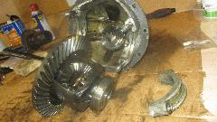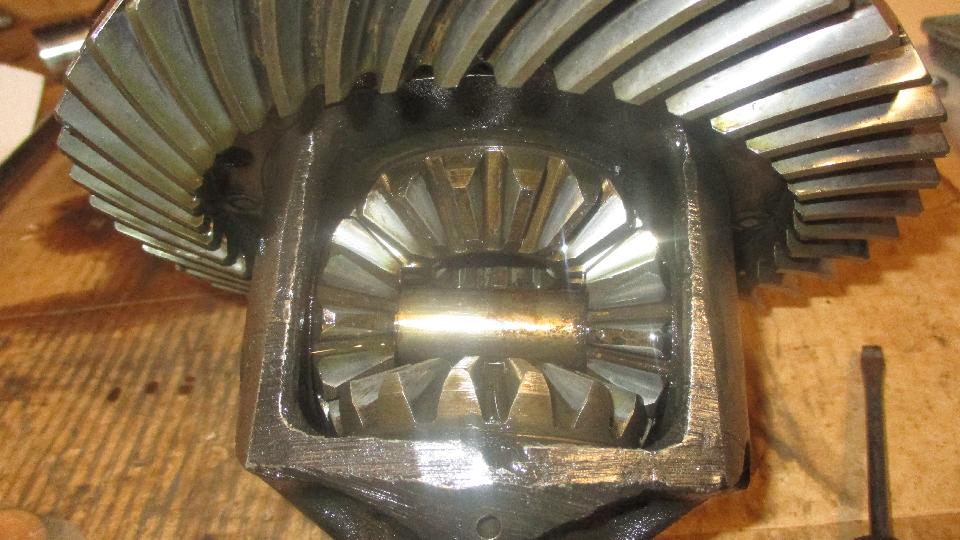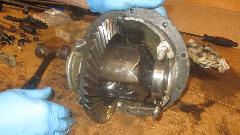 You can hold the empty differential housing on one finger, very little weight in the empty aluminum shell. Quick inspection of the bevel gears and related back-up thrust washers reveals very little backlash and no play on the pinion shaft, so no need to disassemble the differential wheels.