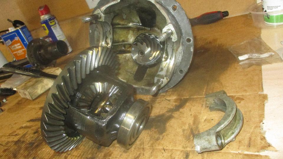 So we switched to a cut-off wheel in an angle grinder, easy peazy. Finish with a cold chisel and heavy hammer to split the race, and it was off in short order. The positioning thrust washer under the large bearing measured exactly 0.125-inch thick, nominal factory dimension aligning the crown wheel and pinion gear mesh, and we will not be changing that one.
