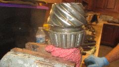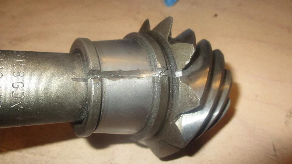 Today we disassembled the differential again to remove the tapered roller bearings form the input shaft. The front bearing was easy, but the rear one was hard tight and more of a challenge. Various big screwdrivers and pry pars wouldn't budge it, so we had to cut it off. Start with the big hammer and punch to dislodge the roller cage. Then have at it with a pair of thin abrasive cut-off wheels. It was working but very slow going on the thick tapered inner race, finally on the verge of overheating my Dremel tool.